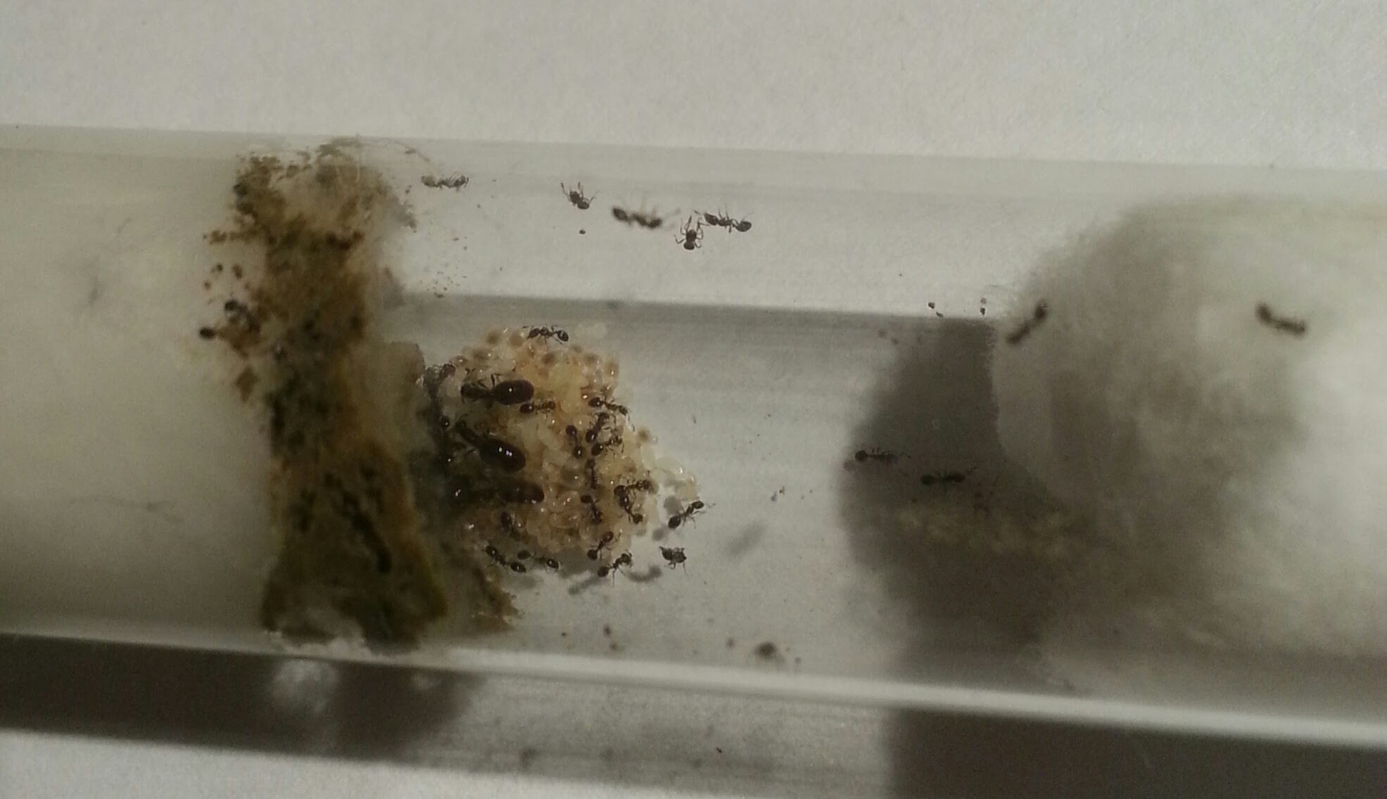 -Camponotus herculeanus ritrovata ancora l'anno scorso in giugno a Claut (circa 800m) . Si è comportata in un modo abbastanza strano, ha deposto un singolo uovo che ha accudito fino a che non è nata la prima operaia (verso agosto) e poi più nulla fino ad aprile di quest'anno quando ne ha deposto un altro. Soltanto quando è nata anche la seconda operaia ne ha deposti altri 6. Attualmente è in una provetta all'interno di una piccola arena (ho sempre paura di disturbare la regina quando do loro un po' di cibo, per questo ho spostato il tutto in arena). Per questa specie sto costruendo un nido scavabile in legno utilizzando del legno ormai sfibrato di pioppo (nel campo dove l'ho recuperato le Camponotus vagus sembrano apprezzarlo).
