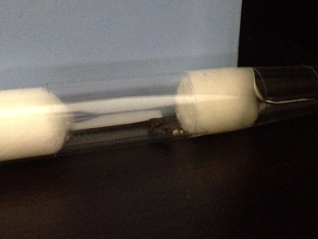 La prima provetta non molto bene, non si vede intera ma c'è una grossa bolla d'aria nel serbatoio che non dovrebbe esserci e l'acqua non è molta. Non riempire il serbatoio con una siringa se no si crea un problema di pressioni e ti si allaga la provetta!! Se finisce l'acqua devi effettuare il trasferimento di regina e covata in una nuova provetta preparata bene. La camera della regina dovrebbe essere lunga il doppio della lunghezza della regina circa, ma credo che possano andare bene anche leggermente più grandi.