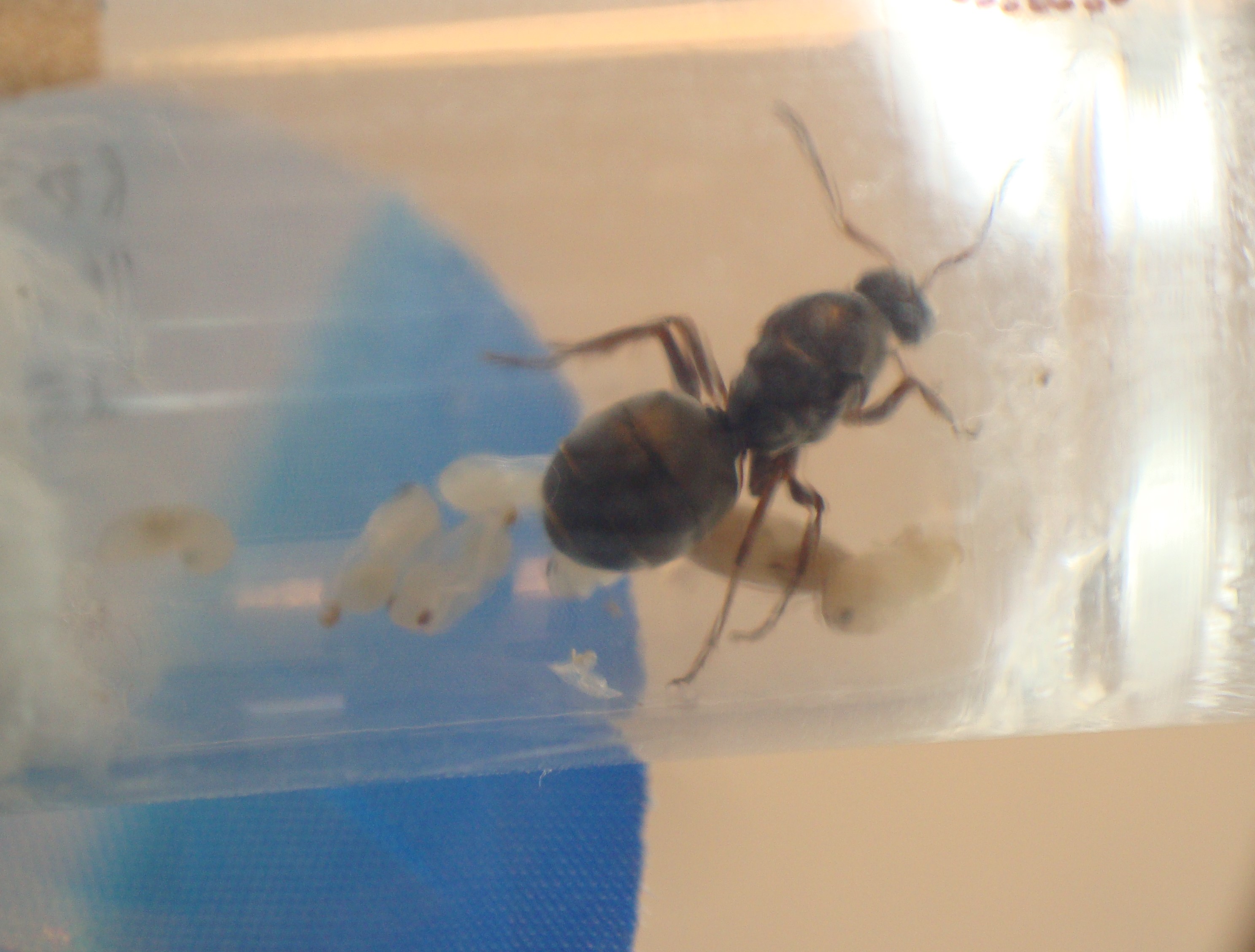 La regina ha deposto il primo uovo in data 24 luglio 2015. Ad oggi, quindi +25 giorni, nessuna operaia è ancora sfarfallata. Mi rendo conto che i tempi di sviluppo sono in linea a quelli indicati per questo genere, ma tenuto conto dell'ondata di caldo avuto, e paragonandola alle vicine di provetta, la cosa sembra lo stesso un po' anomala. Di per se non mi preoccuperei se non fosse che il gastro della regina appare estremamente contratto. Non appiattito come per le Lasius ma è ridotto di dimensioni anche mantenendo una forma "sferica".