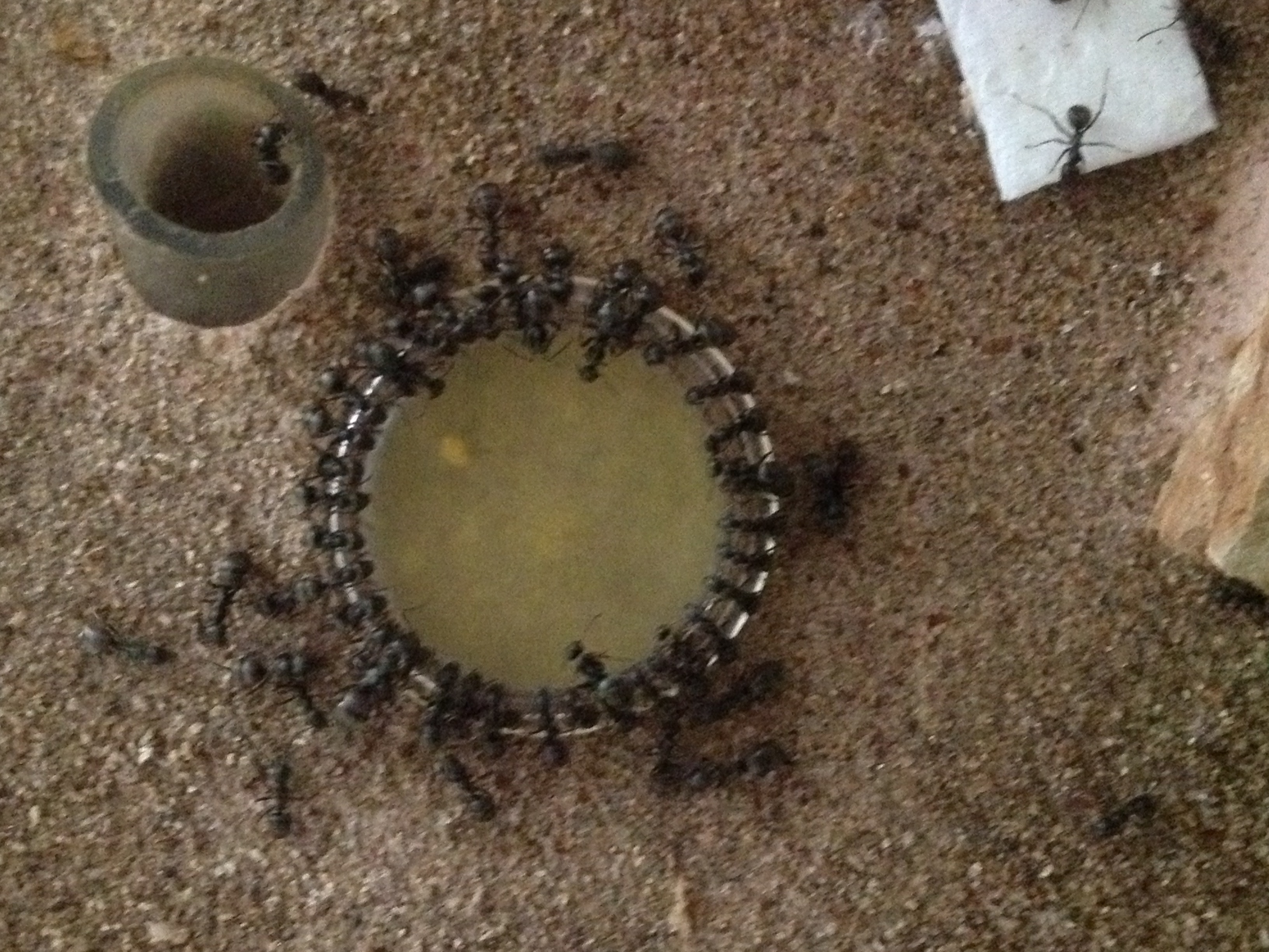 Anche le mie Messor capitatus raccolgono i granuli di polline interi e li portano nel nido. Devo anche riportare che ho provato a sciogliere i granuli di polline nella soluzione acqua e miele e noto che in questo modo la soluzione è molto più appetita - allego una foto delle Formica fusca perché è buffo come si dispongono a cerchio attorno al contenitore. Sono le uniche a cui posso dare la soluzione liquida senza paura che ci anneghino dentro.