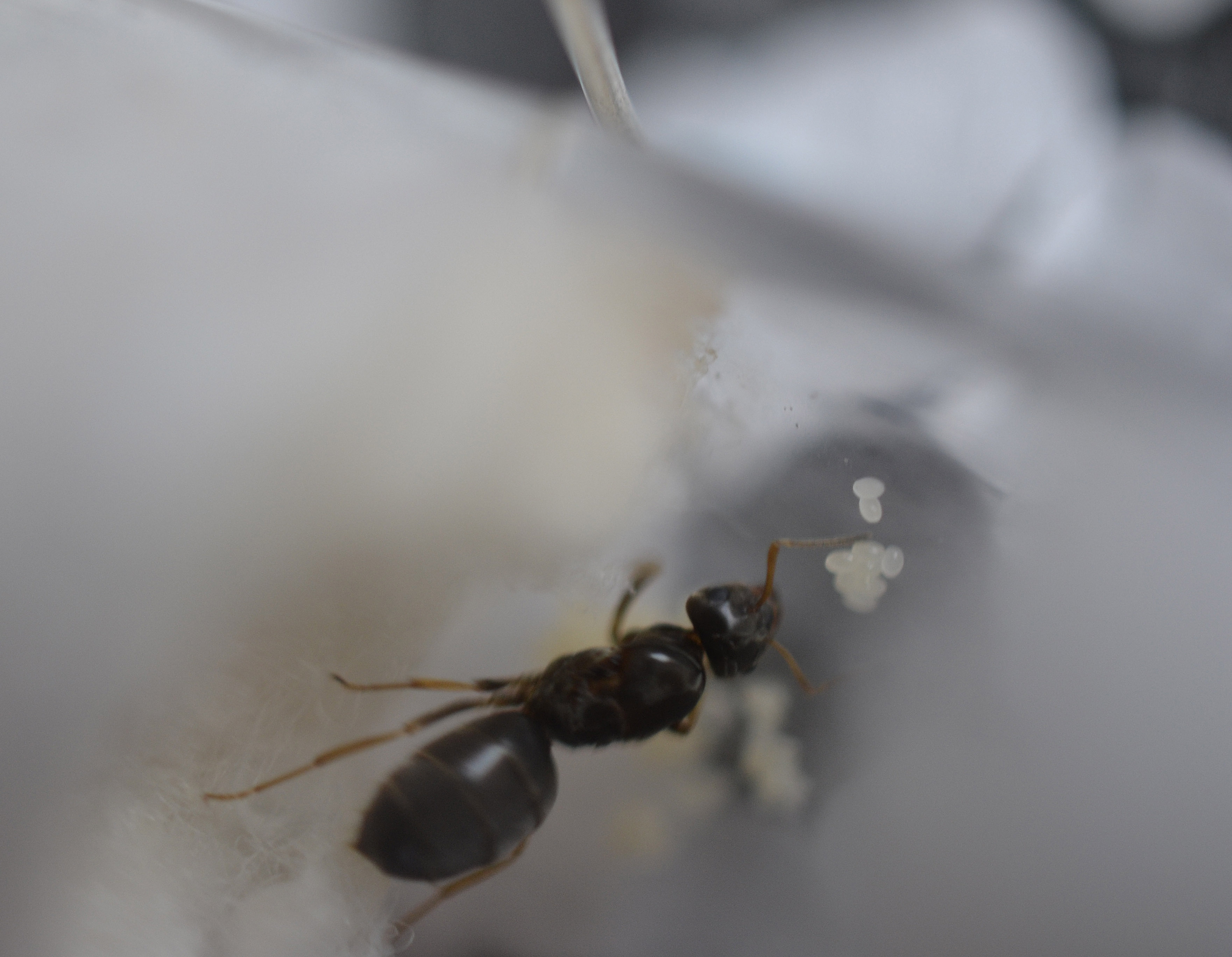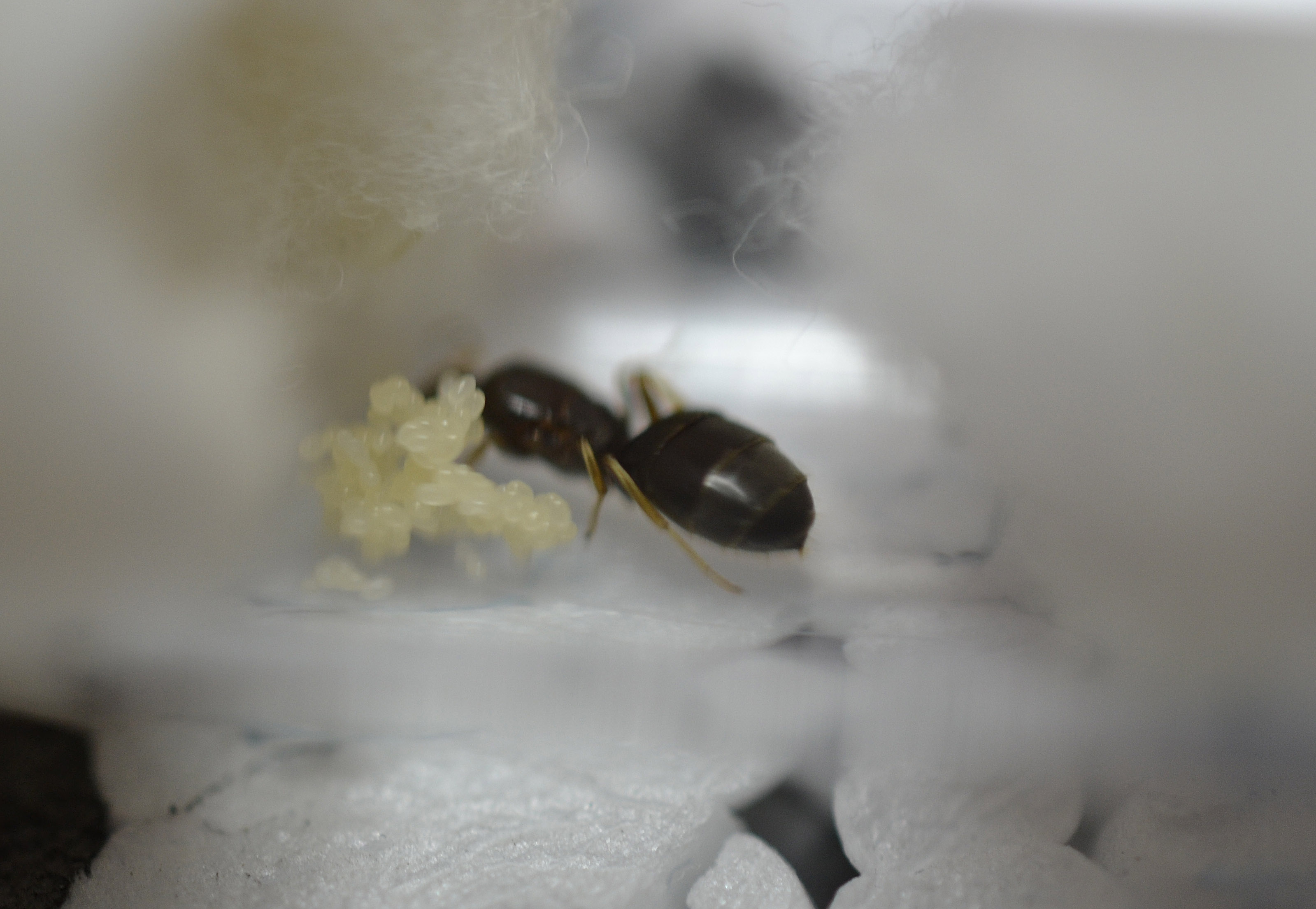 Ciao a tutti! Avrei bisogno di un consiglio su questa regina di Lasius sp. che ho trovato già dealata in data 04/07/2016. Fino ad oggi è comparsa una bella covata ma ancora nemmeno l'ombra di un bozzolo (dopo più di un mese e ad una temperatura media di 30 °C)...è normale? Potrebbe essere sterile o magari sciamata la scorsa stagione (l'addome non mi convince del tutto e non vorrei avesse bisogno di essere alimentata)?