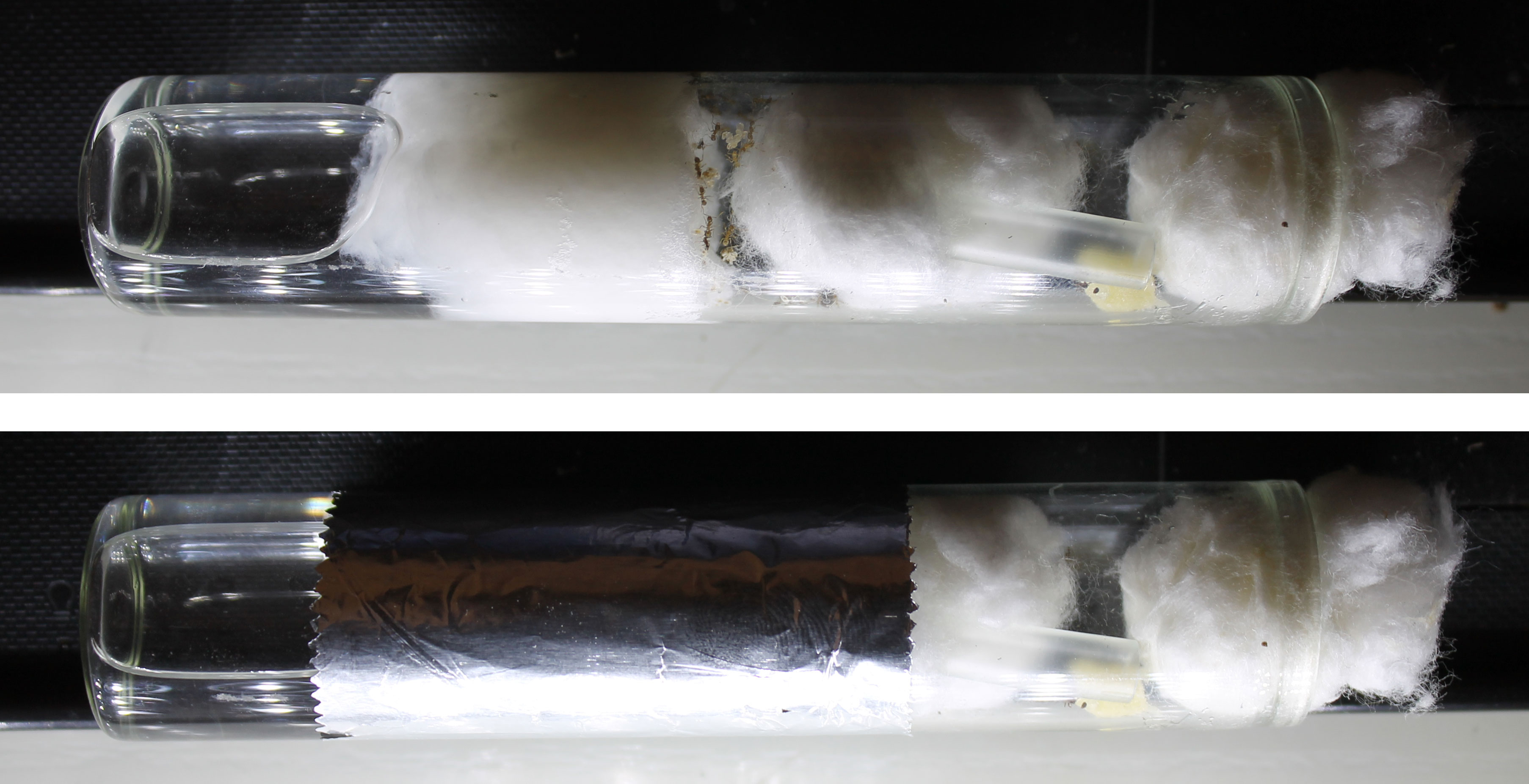 Questo mi è comodo perchè quando levo la provetta dal suo alloggio buio le inquiline si agitano di meno e non si riversano nella secona camera, quindi così ho tutto il tempo e la comodità di aprire il tappo di cotone, levare scorie del cibo vecchio, fornire il nuovo e così via...