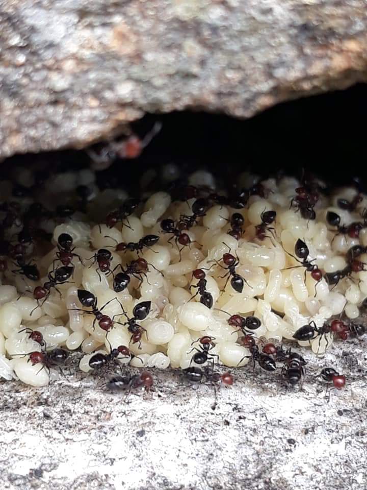 Oggi mentre andavo a passeggiare per un assolato e sperduto sentiero di montagna,ho osservato un nido di Crematogaster che facevano maturare la covata al sole.