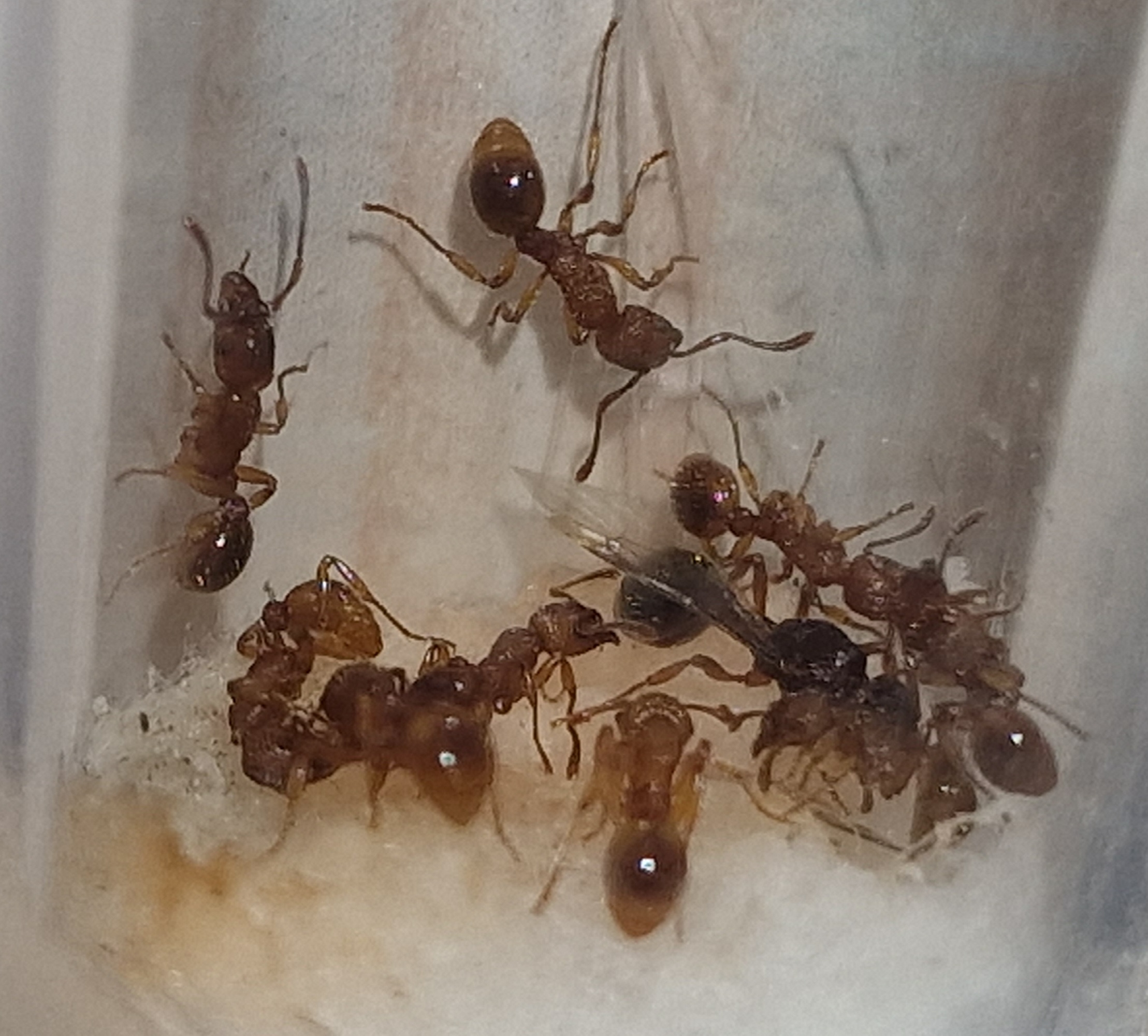 2 settimane fa ho trovato un'altra regina di Myrmica (trovata completamente in altra zona della cittá rispetto alla precendete) che purtroppo non si è dealata. L'ho inserita forzatamente in arena e per quanto all'inizio l'hanno studiata e un pó attaccata, senza causargli danni visibili, ora si é ambientata e convive insieme alle operaie.