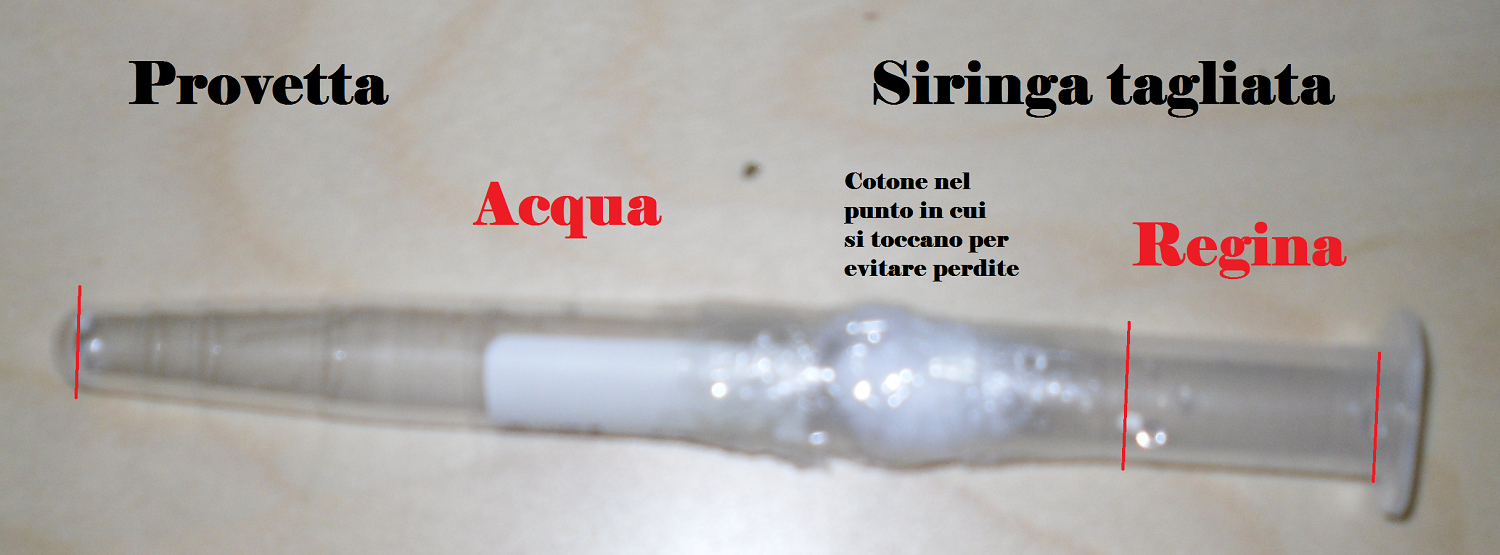 Allora se hai fatto come ti ho detto io non avrai problemi,se hai messo il tappo dopo l'incastratura allora l'acqua se ne va via lo stesso(anche se la provetta la metti rialzata) e la regina muore disidratata!!