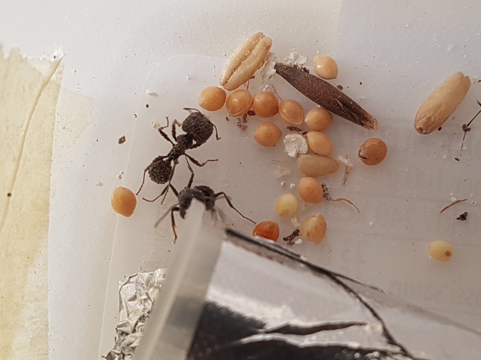 Trasferimento avvenuto! Le ho fatte trasferire in una provetta più piccola di quella precedente, perché così non ci possono essere problemi sulla grandezza della loro provetta. Inoltre le ho lasciate libere in arena in modo che potessero raccogliere semi se gli andasse ed anche per poter controllare la situazione degli acari più facilmente.