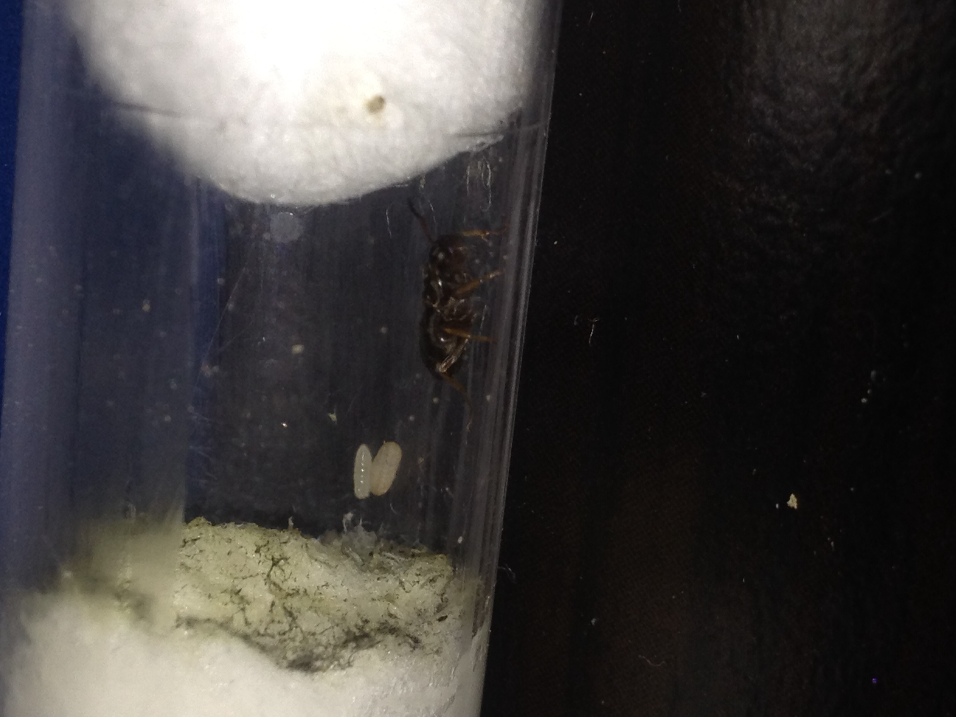 Ciao ragazzi, ho questa regina di lasius SP dall'estate 2015. Quest'inverno è morta tutta la colonia di una 30ina di operaie che le avevo messe in unarena(credo xke gli avevo dato da mangiare delle cose tossiche forse).. L'ho rimessa in provetta la regina e per 2 settimane non ha fatto nulla. Poi ha ricominciato a deporre e mi sembrava ne avesse fatte molte. Non capisco se le altre se le è mangiate e ne ha lasciate solo 2 crescere o meno! Potete darmi qualche consiglio grazie. L'acqua nel serbatoio è finita da 2/3 settimane ormai. Gli metto un po d'acqua nel cotone ma tutte le volte si stressa. Conviene aspettare che si schiudano le uova prima di collegare l'altra provetta e oscurarla? Grazie x i consigli.. Non capisco xke non depone più! La muffa che c'è sul cotone deriva che avevo messo un insetto che avevo ucciso e i resti li avevo lasciati x un po(li ho tolto ora)