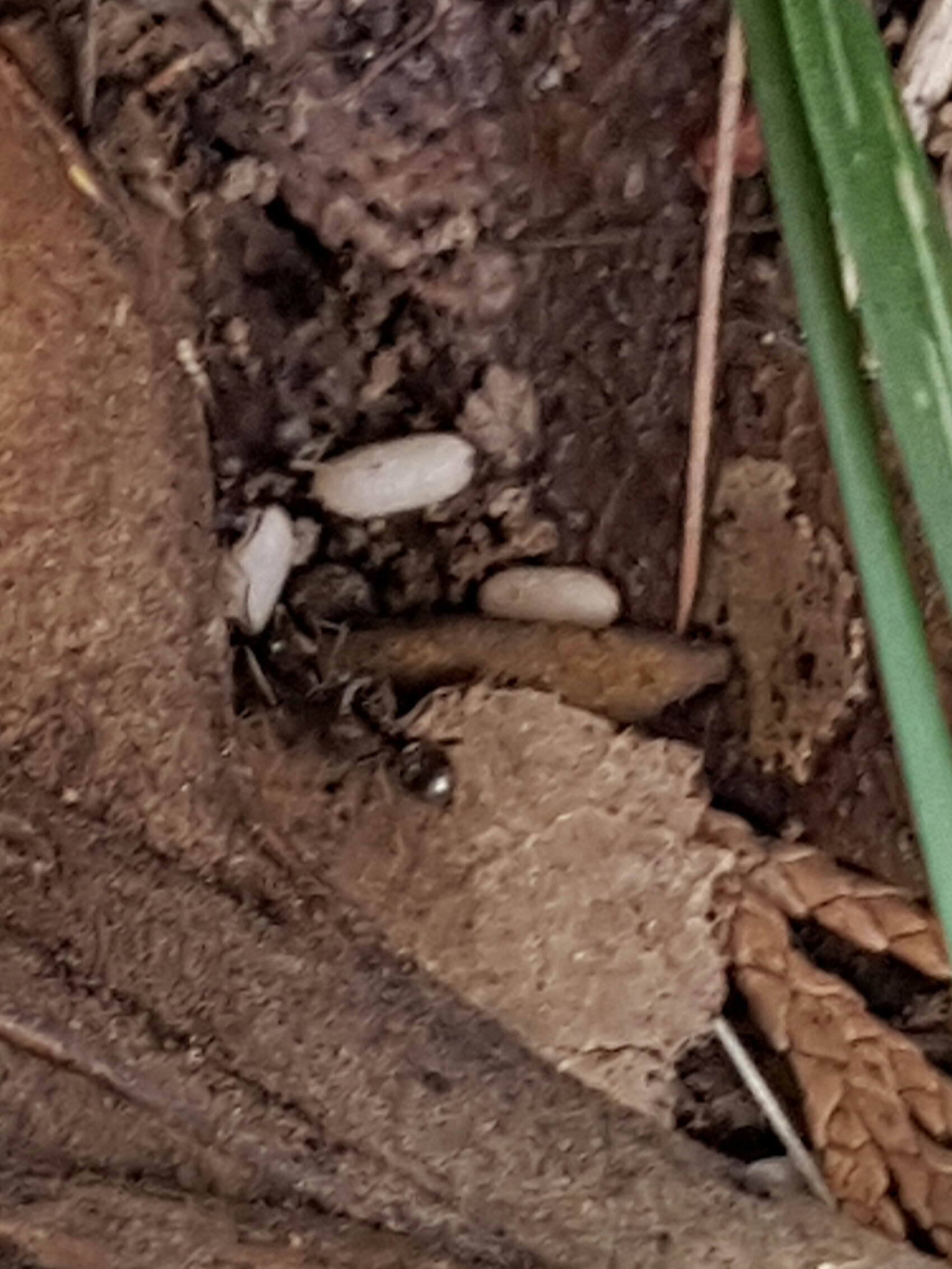 Se quei bozzoli sono loro sicuramente non sono C. scutellaris, ma potrebbero essere delle Formica sp.. In questo caso il nido sarebbe nella terra con la regina in una camera ad una certa profondità quindi converrebbe lasciare tutto stare.