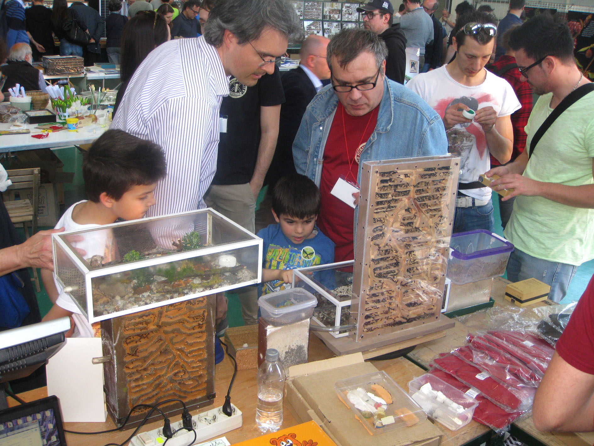 Allarmato da un simile scempio sono andato al bancone di Formicarium ed ho informato Yuri ed altri della situazione, che sono subito accorsi. Onestamente le due ragazze del bancone sembravano del tutto in buona fede e completamente all'oscuro di qualunque nozione di base in fatto di mirmecologia, ma spero che nella giornata qualcuno le abbia un po' istruite... anche perche' sembravano realmente interessate, Io per primo nel mio piccolo ho spiegato loro quelle che sono le basi, che ormai penso di aver imparato.
