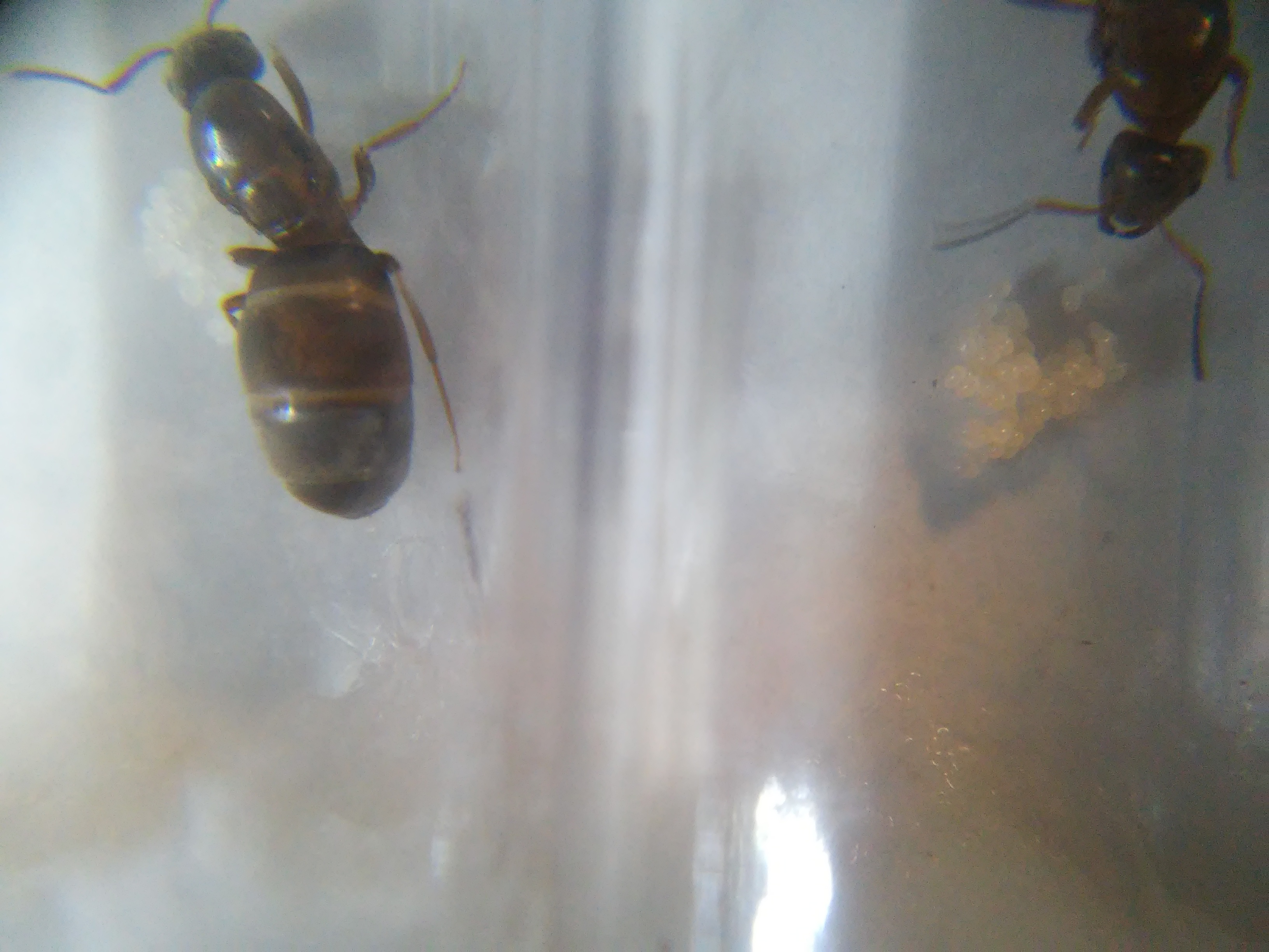 Io ho la mia colonia di Camponotus piceus la cui regina, dopo aver cambiato l'alimentazione privilegiando la frutta al miele, sta deponendo uova di colore diverso.