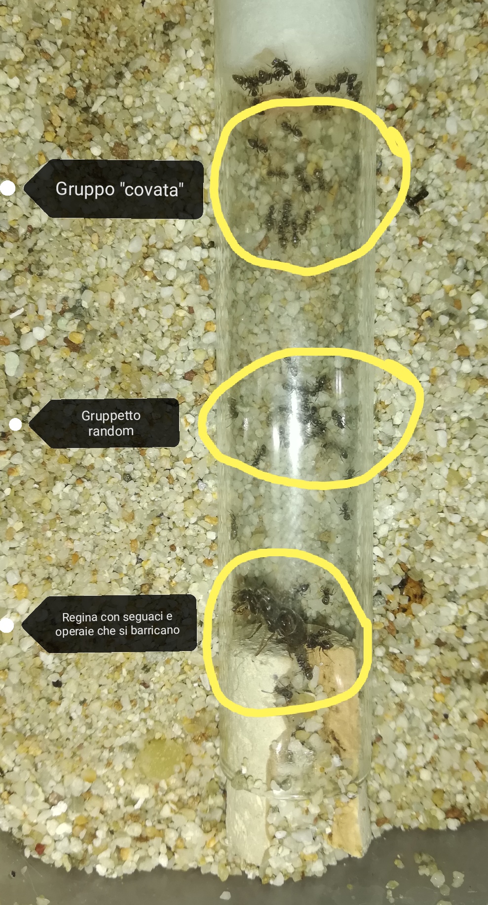 1) a seconda degli alimenti, la regina si potrebbe spostare. Ciò è capitato recentemente anche con me dando un po' di arancia alla mia colonia di Lasius emarginatus, la parte più importante della colonia si è stabilizzata nella parte mediana della provetta... perché? Io ho supposto che fosse un fenomeno collegato con lo sviluppo della fisiogastria e quindi di fatto con l'aumento di volume di ciascuna formica.