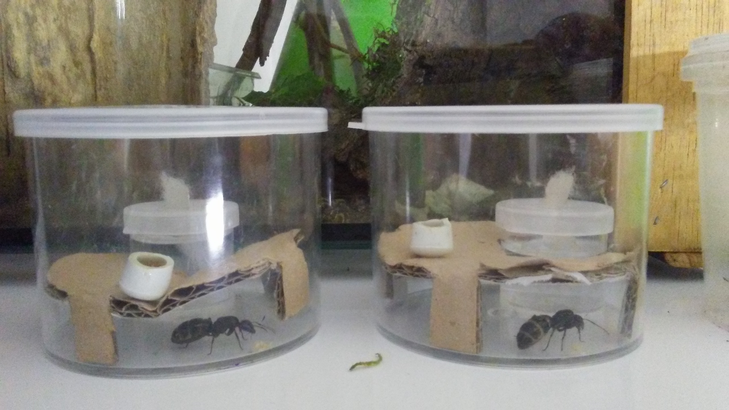 Ciao a tutti ho raccolto 2 regine molto grandi, dovrebbe trattarsi di Camponotus Vagus ho subito notato che nella provetta di circa 10-12cm dove di solito riesco a gestire le mie colonie di Lasius , queste regine giganti hanno bisogno di più spazio per girarsi quindi ho dovuto ridurre la quantità di acqua per lasciar loro libertà di movimento,Ho anche notato che non hanno gradito la situazione di cattività e appena catturate hanno iniziato a scavare il cotone che fa da tappo alle provette con le loro enormi "tenaglie"