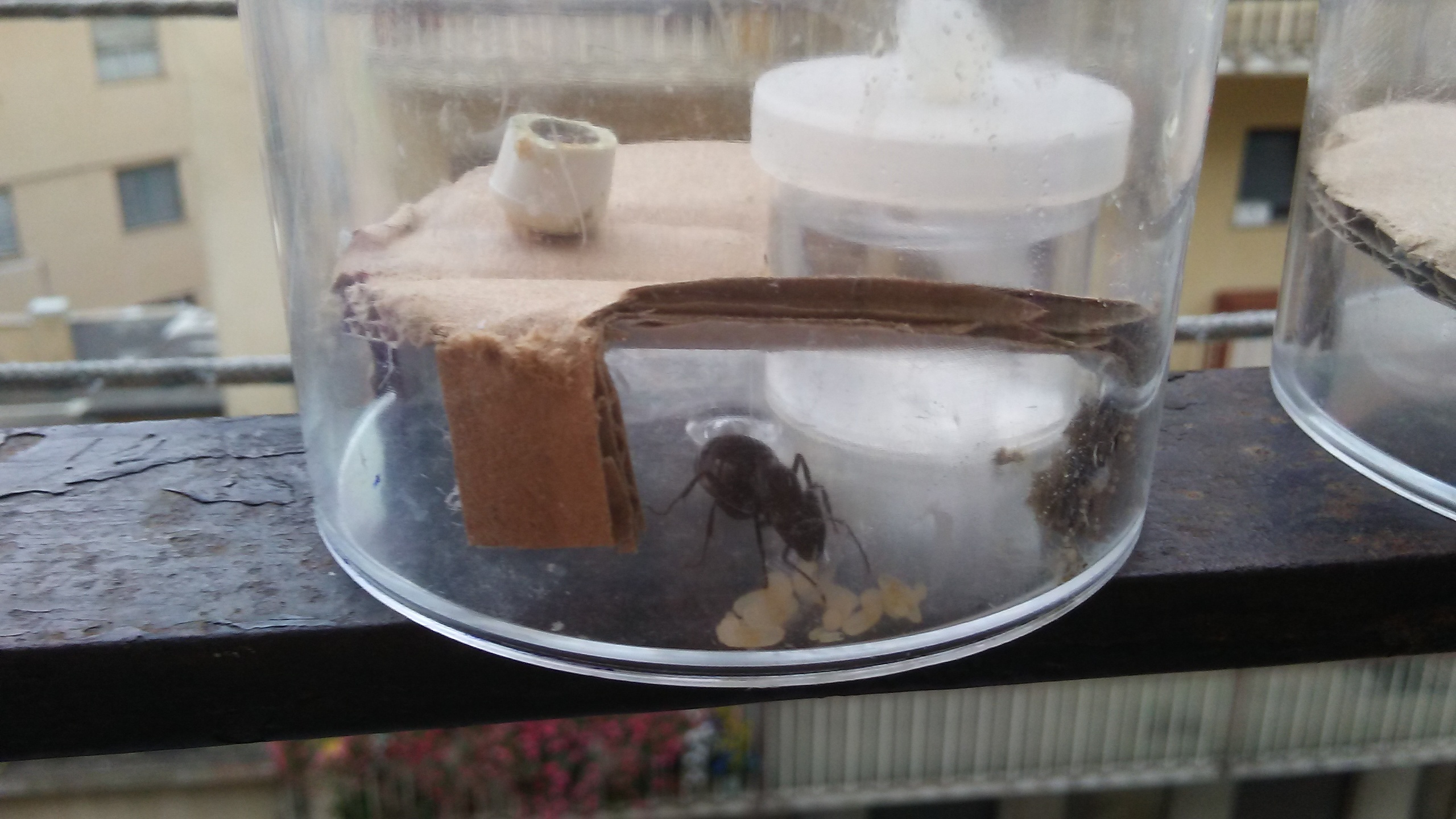 La mia colonia è di Camponotus Vagus, effettivamente hanno bisogno di spazio, però durante la prima deposizione di uova tendono a rintanarsi,anche in luoghi piccoli... l'hai trovata senza ali?