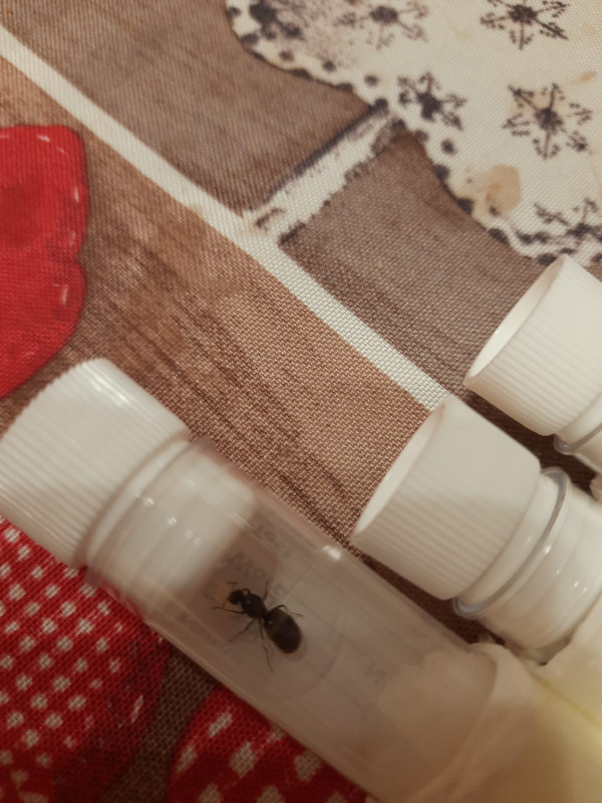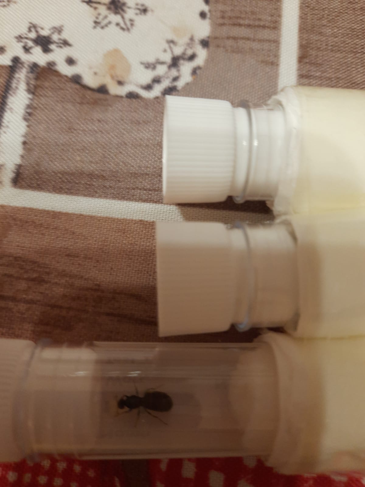 il tappo l'ho bucato con l'ago di una siringa, l'aria passa comunque, ho letto sul forum che qualcuno faceva così... mi sembrava una chiusura più sicura del cotone. le uova stanno lì da 15 giorni circa. Le regine ci stanno sempre sopra però sono minuscole e non vedo nessun cambiamento da quando le hanno deposte, qui la temperatura media è di 29 gradi... si muore di caldo.