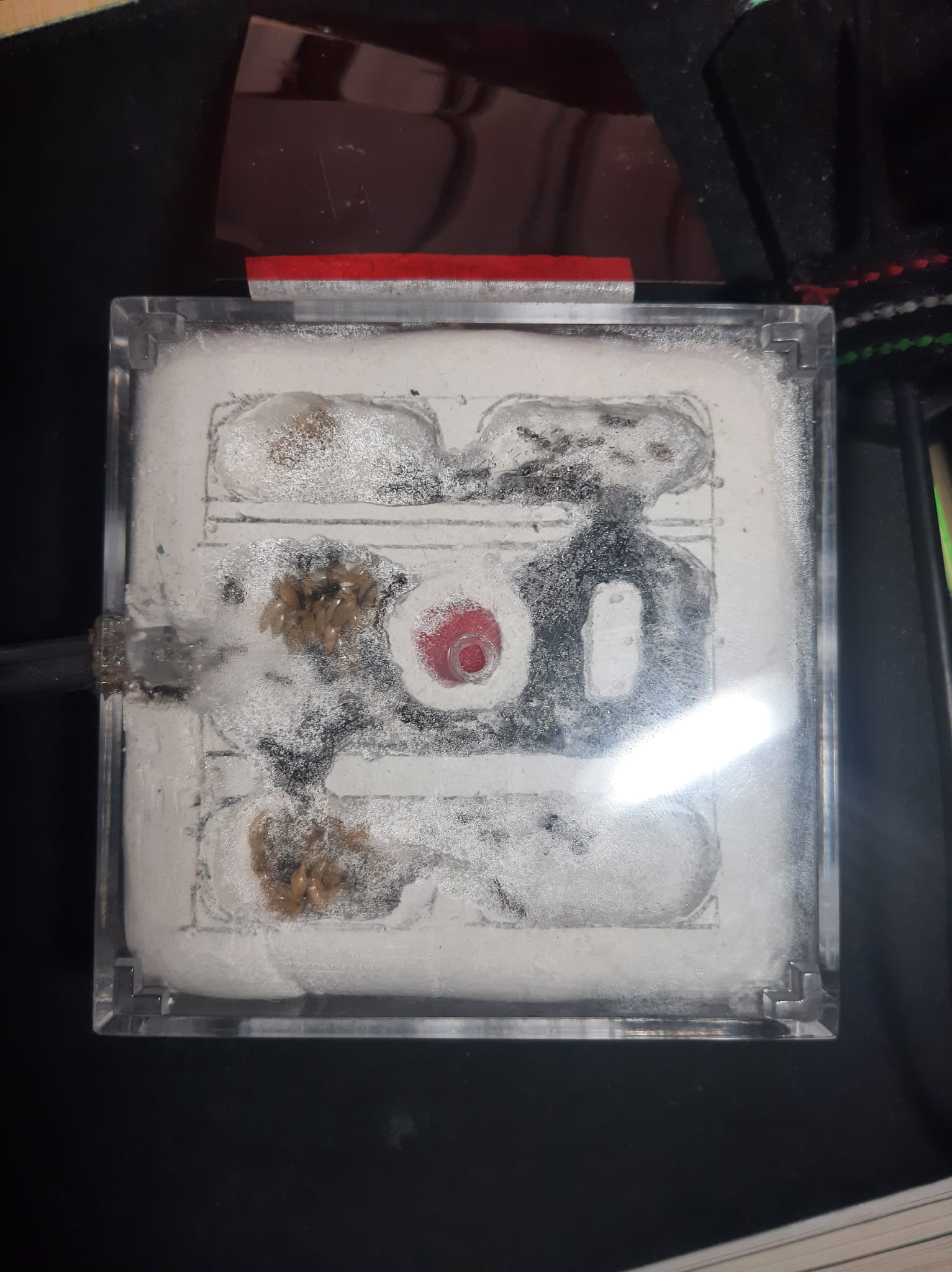 ieri ho effettuato un trasferimento della mia colonia di Messor barbarus in un formicaio da me ideato in gesso, essendo purtroppo l'unico materiale in grado di lavorare. Sono circa 150 operaie e nella foto si vede un ammassamento in un unico posto data la paura per la luce, ma posso assicurare che il formicaio sia giusto per dimensioni. Purtroppo ho notato della polvere di gesso in arena, che deve essere stata scavata da questo buco che loro stesse hanno iniziato senza un apparente motivo subito appena trasferite. Il problema e' che, nonostante sia comunque spesso 4 cm, e' che riescano a bucare il gesso sotto senza che me ne accorga. Come posso fare?