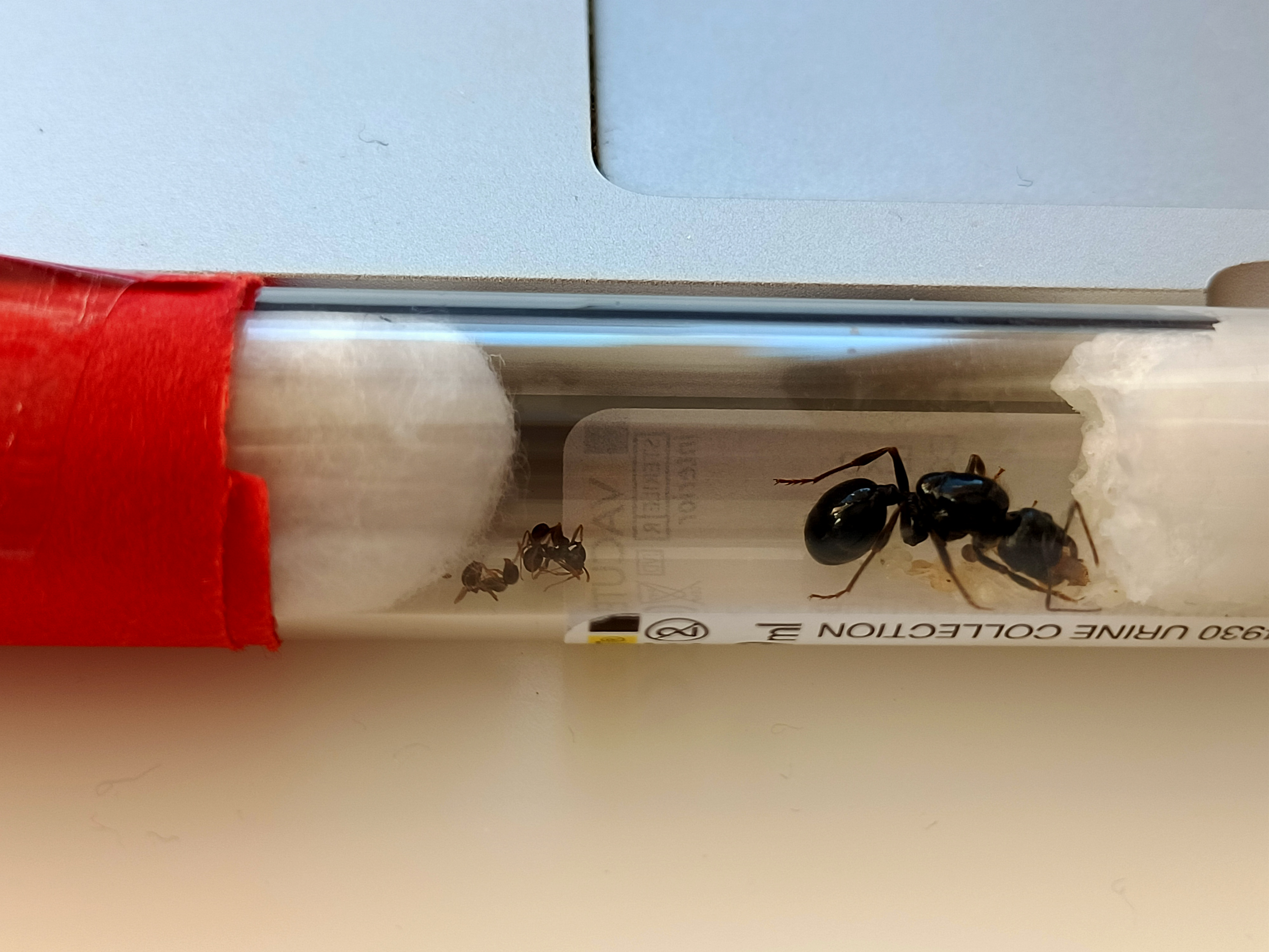 Oggi controllo la provetta dopo un po' di tempo, ed ecco cosa vedo: noto subito 4 operaie, di cui due che si muovono (anche se lentamente) mentre le altre no; pezzi di altre due operaie, una testa e alcune zampe vicino a dove avevo messo il cibo (semi di tarassaco e zucca triturati).