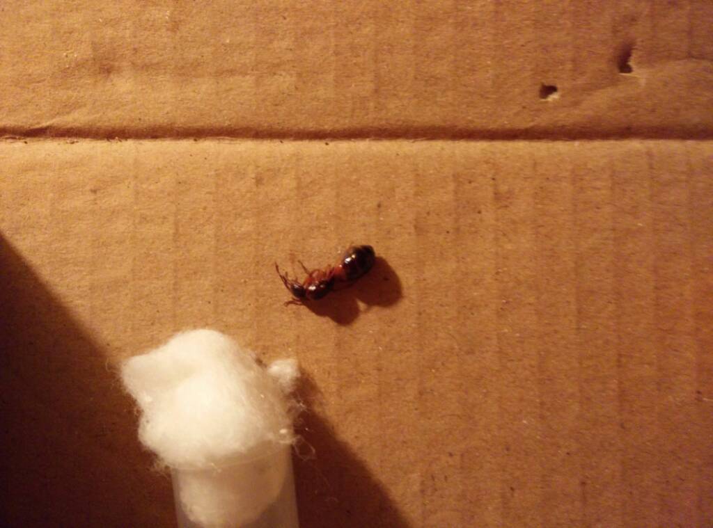 Questa mattina, con mio grande rammarico, mentre le aethiops sono ancora fuori ma la regina non è più sulle zampe ma completamente poggiata terra da sembrare praticamente morta. appena visto questo apro l'arena, tocco la regina che resta aggressiva, ma non riesce a muovere due delle zampette e quindi a mala a pena si trascina... Le operaie sono invece assolutamente vispe e una anche con il gastro pieno segno che apprezzano la dieta bathkar con cui da qualche settimana le sto nutrendo.