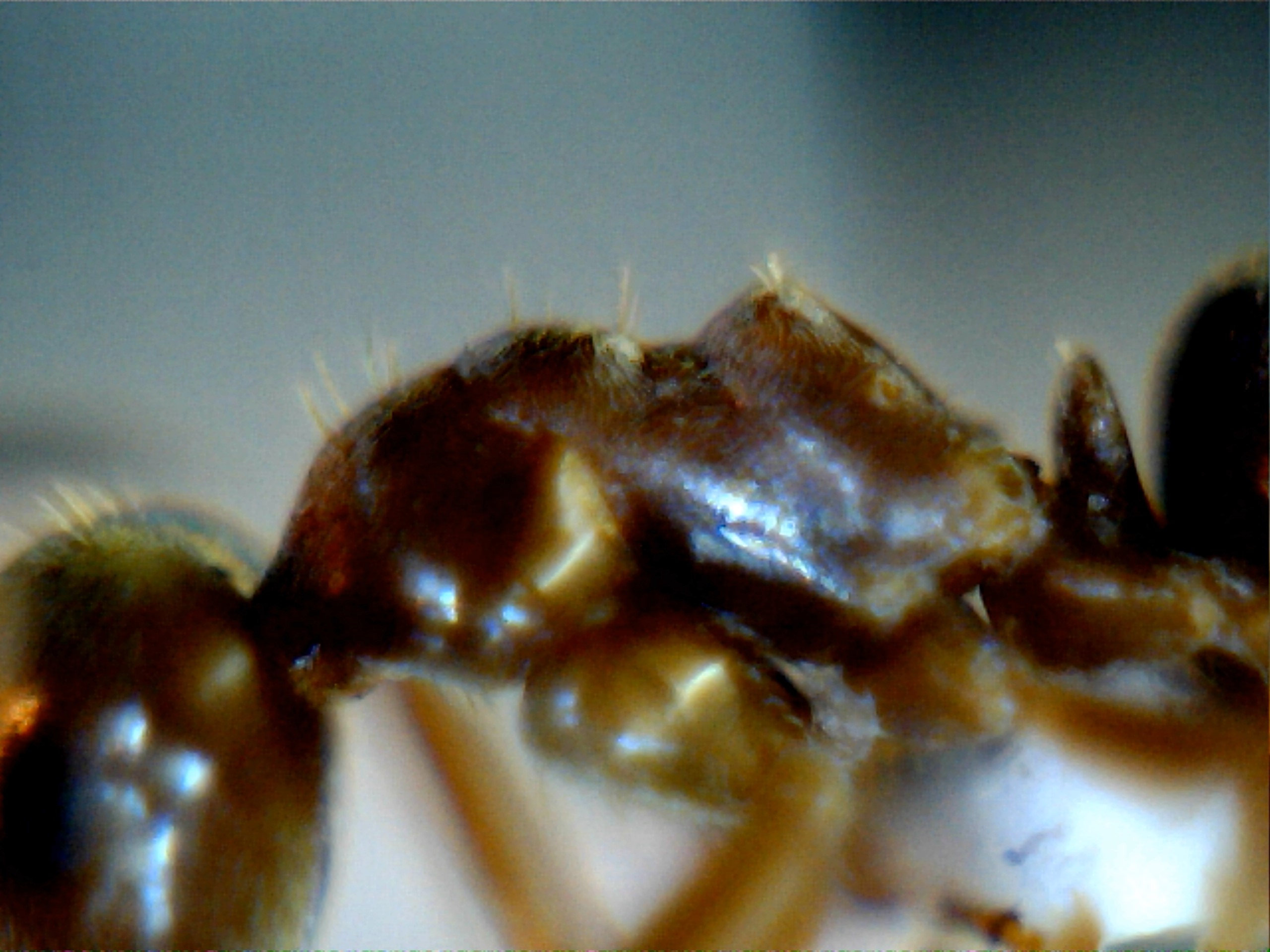 I peli sugli scapi sono rasi, non eretti. Dalle foto che sto per mettere si dovrebbe confermare. Uso un microscopio usb economico... Ahimè è l'unico strumento che per ora possiedo per identificare le formiche a casa (come puoi ben vedere, non sempre è facile con questo strumento a causa della risoluzione). Ti metto le foto sperando che possano andare bene.