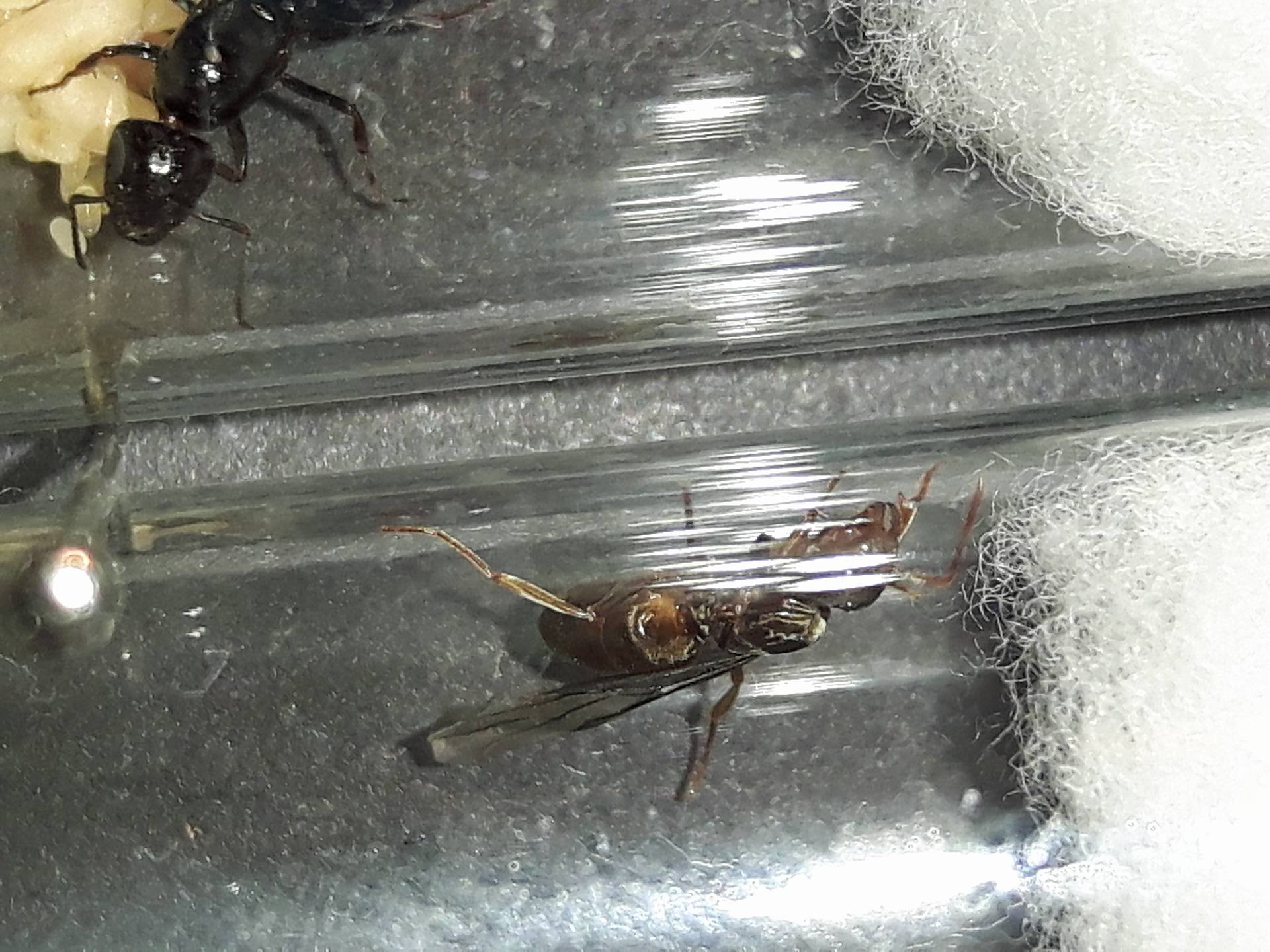 La questione con quel Camponotus è questa: molte cose puntano verso il vagus (periodo, velocità di nascita delle operaie, abbondanza della prima covata), ma con 8 mm di lunghezza, se sono corretti, è eliminato al 100%, è meno della metà di una regina di C. vagus. Restano solo i Myrmentoma con queste misure e sia lateralis, sia piceus, sia fallax non fanno di solito fondazioni del genere. In Francia tra l'altro non ci sono neanche altre opzioni più insolite come il gestroi e il tergestinus. Il piceus sciama più tardi, il lateralis non è se l'operaia ha la testa nera e il fallax potrebbe essere, ma la regina non mi sembra proprio per niente fallax. E poi ho allevato varie volte il fallax: non ho mai visto più di 3 bozzoletti striminziti insieme. Francamente... non lo so di che si tratta! Una foto del profilo dell'operaia sarebbe utile, ma ho quasi paura a chiedertela...