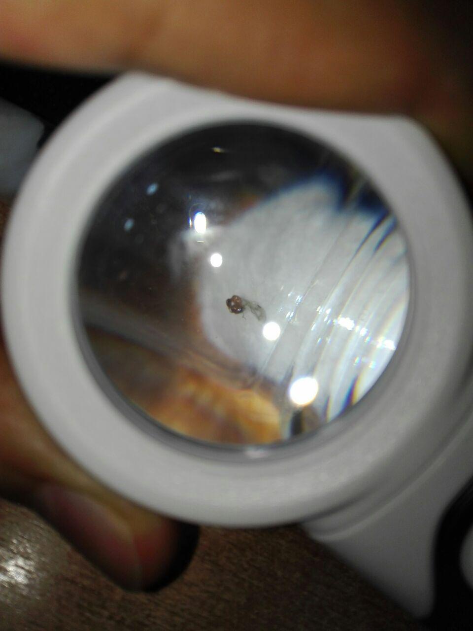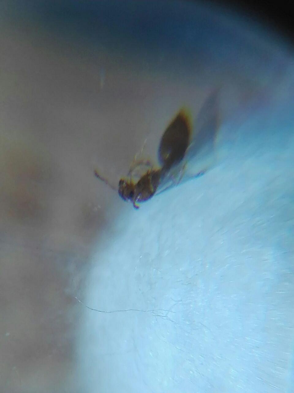 ) osservato con lente 15x è poco peloso, di colore rossastro, con testa più scura e grande addome. Sulla parte più larga dell'addome,superiormente , ci sono delle linee orizzontali scure, 1 grande e due più piccole. Ha due occhi neri , le antente tipo quelle delle formiche con estremità più larghe.