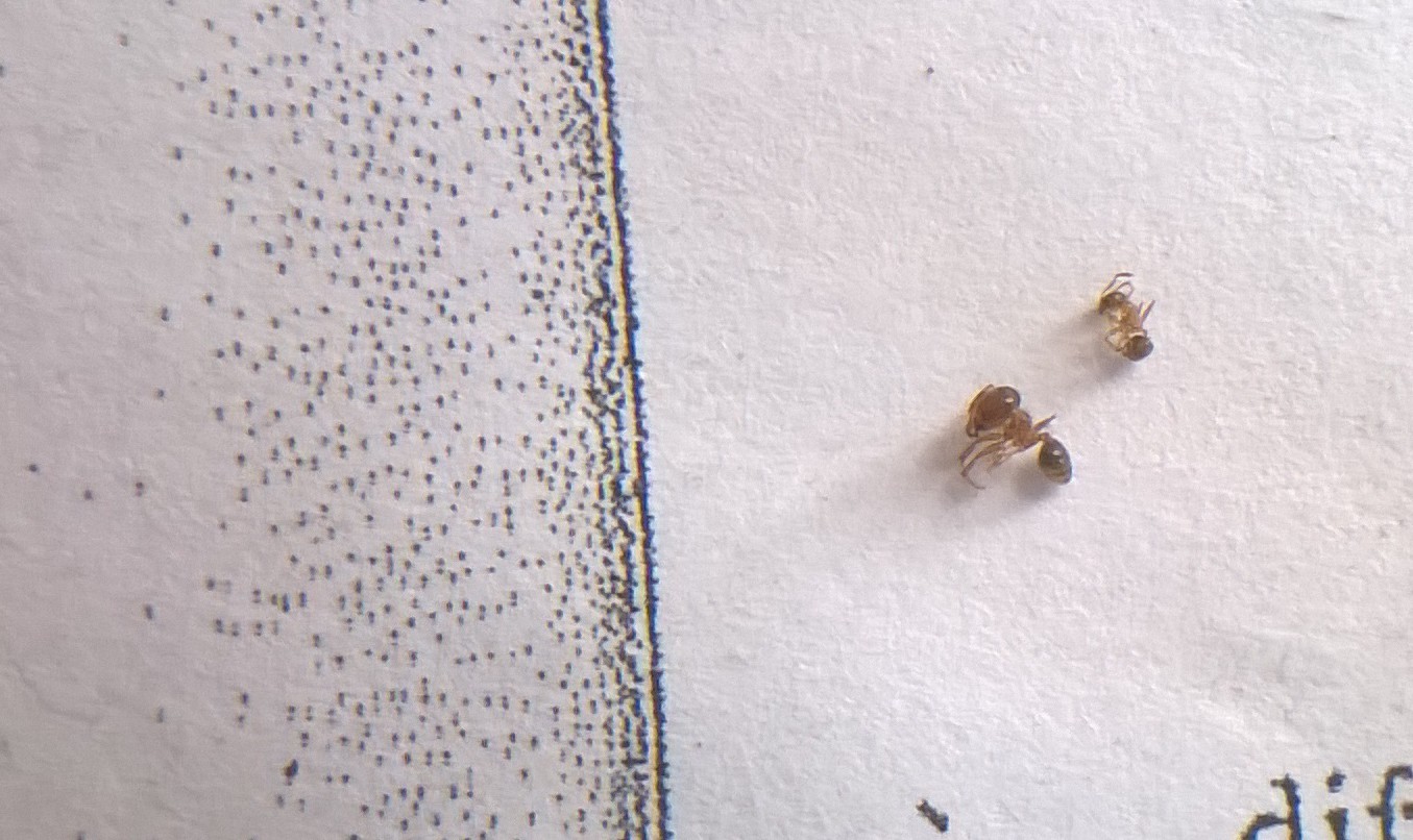 C'è un'altra guerra in corso! Queste piccolette, 2-3mm, hanno dato del filo da torcere alle esploratrici Messor wasmanni. Sono rapide, voraci e attaccano in gruppo..ho notato tra loro alcune major (soldati?) dalla testa più grande del gastro, che accompagnavano sul lato esterno delle loro fila..