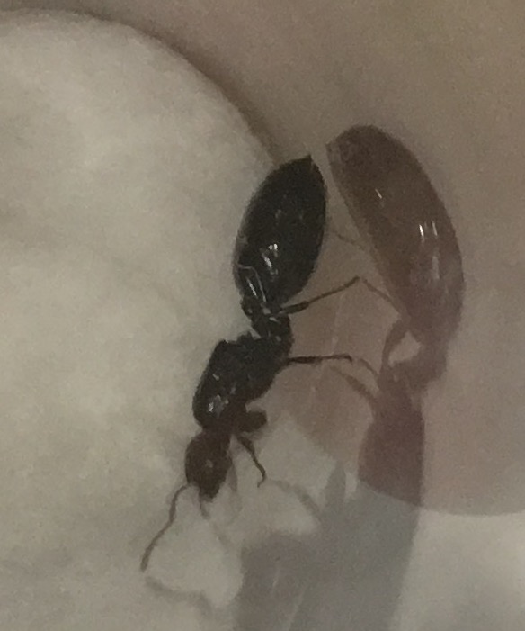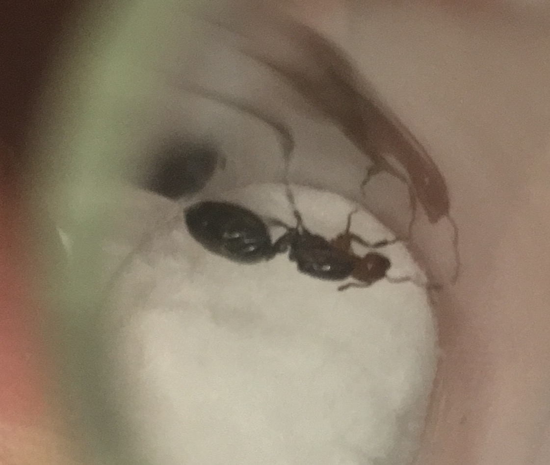 Crematogaster scutellaris è la specie. Prepara una provetta con molta acqua nel serbatoio e 2 cm di spazio per lei e lasciala in un posto tranquillo per tutto l'inverno, possibilmente a temperature tra 5-10º C. Così tra febbraio e marzo comincerà a deporre
