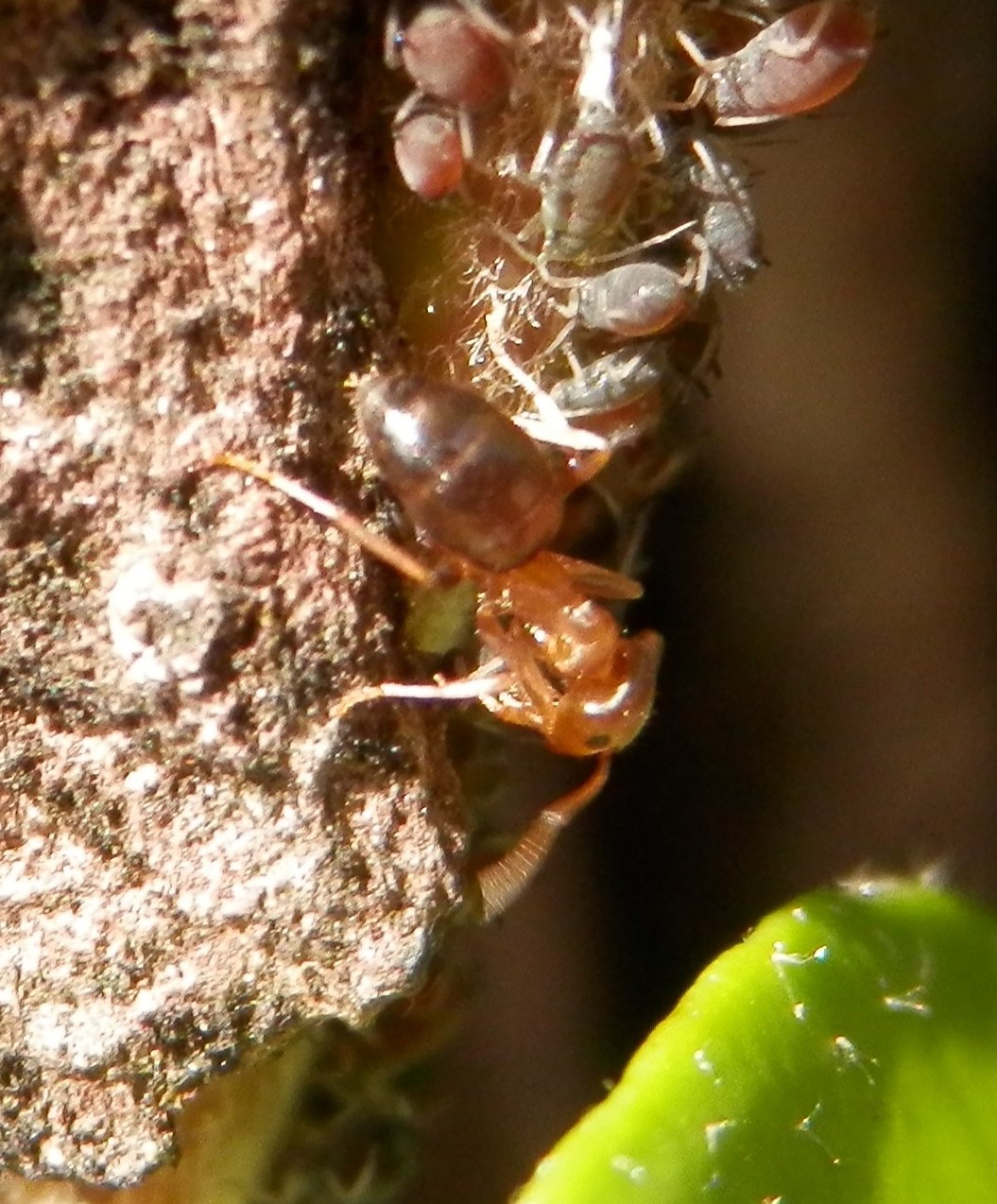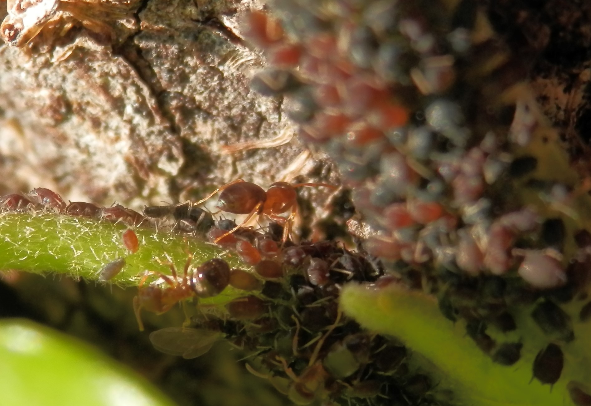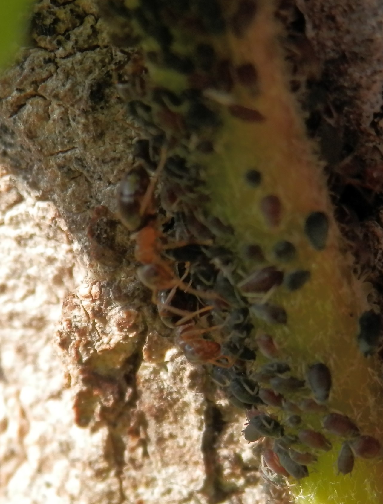 Avevano costruito dei sentieri nelle valli della corteccia, chiaramente rifiniti da pareti e a volte tunnel di terra. La cosa più notevole era la quantità di afidi che allevavano sull'edera che comincia timida a risalire l'albero.
