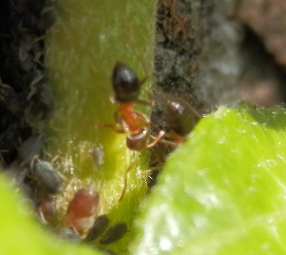 Oggi girovagavo per il mio giardino volendo fare un censimento delle specie che lo popolano. Su un ippocastano che non avevo mai esaminato ho scoperto una notevole colonia di formichine, che la facevano da padrone sulle pareti dell'albero, nonostante varie Camponotus erranti.