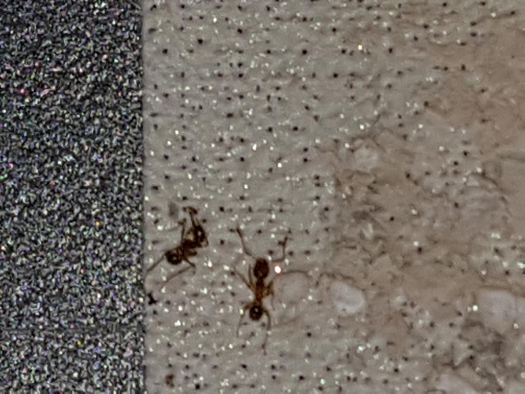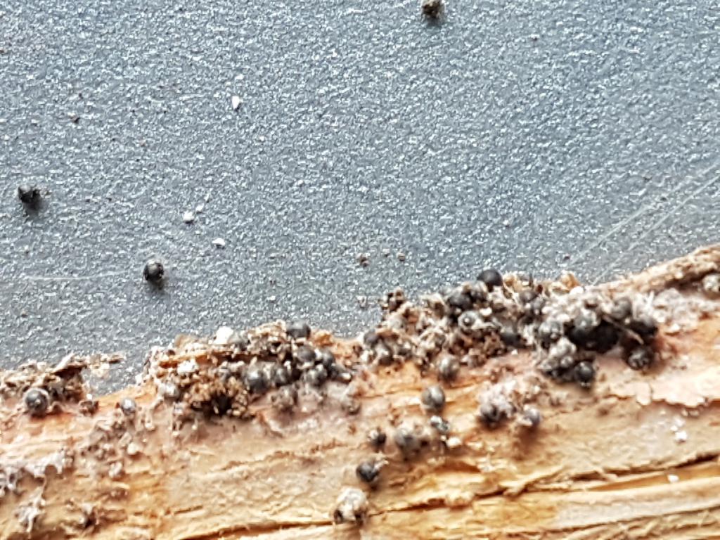 Ho trovato nel parquet un pò marcescente a causa di un allagamento, delle erosioni con pareti lisce, cunicoli, tra i quali erano presenti numerosissime formichine, di quelle che si trovano sul pane abbandonato o su insetti morti, ma anche alcune con la testa gigante. Mi ha colpito che nel parquet mangiucchiato e tutto intorno erano presenti tantissime piccole palline nero grigio traslucide, come se fossero uova.