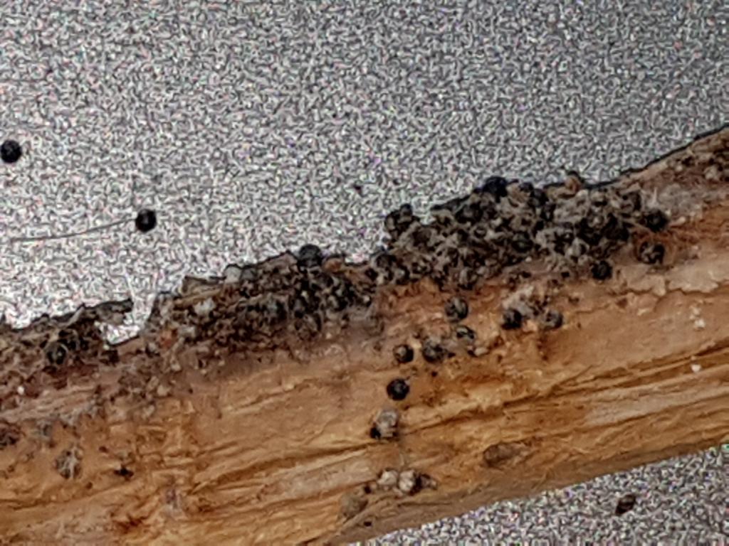 Ciao, dalle foto si direbbe più un lavoro di termiti, le palline nere potrebbero essere le loro deiezioni.