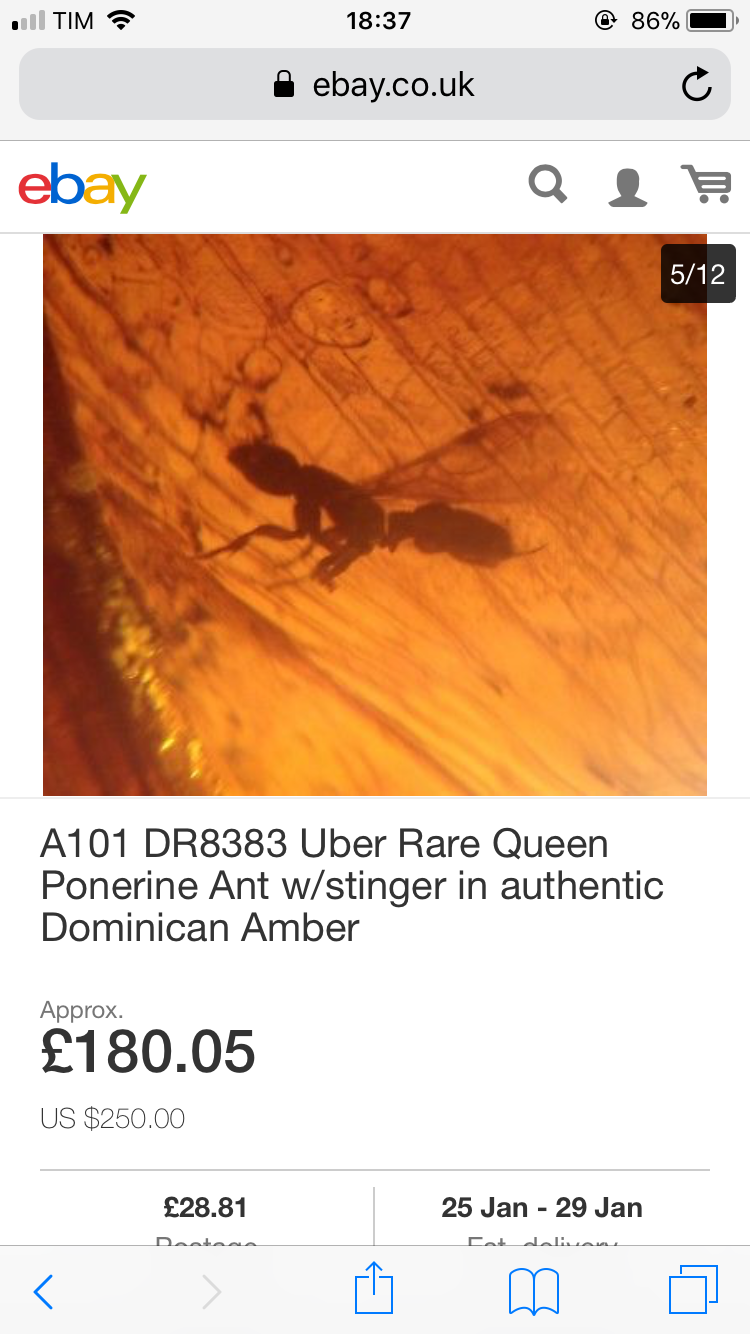 Guardate, non ero minimamente interessato a comprare... semplicemente mi sembrava che la prima avesse una morfologia moderna, per quello ho chiesto se tali specie esistono ancora...grazie per le spiegazioni sull’ambra, non sapevo che esistessero falsificazioni... comunque, cercando un po’ su internet, ho visto che nel cretaceo c’erano delle specie davvero interessanti: tipo la cosiddetta formica vampiro... inoltre ho visto una ricerca secondo cui alcune specie estinte di formiche erano cacciatori solitari, evolutosi da antenati comuni alle vespe, e non conducevano vita sociale..
