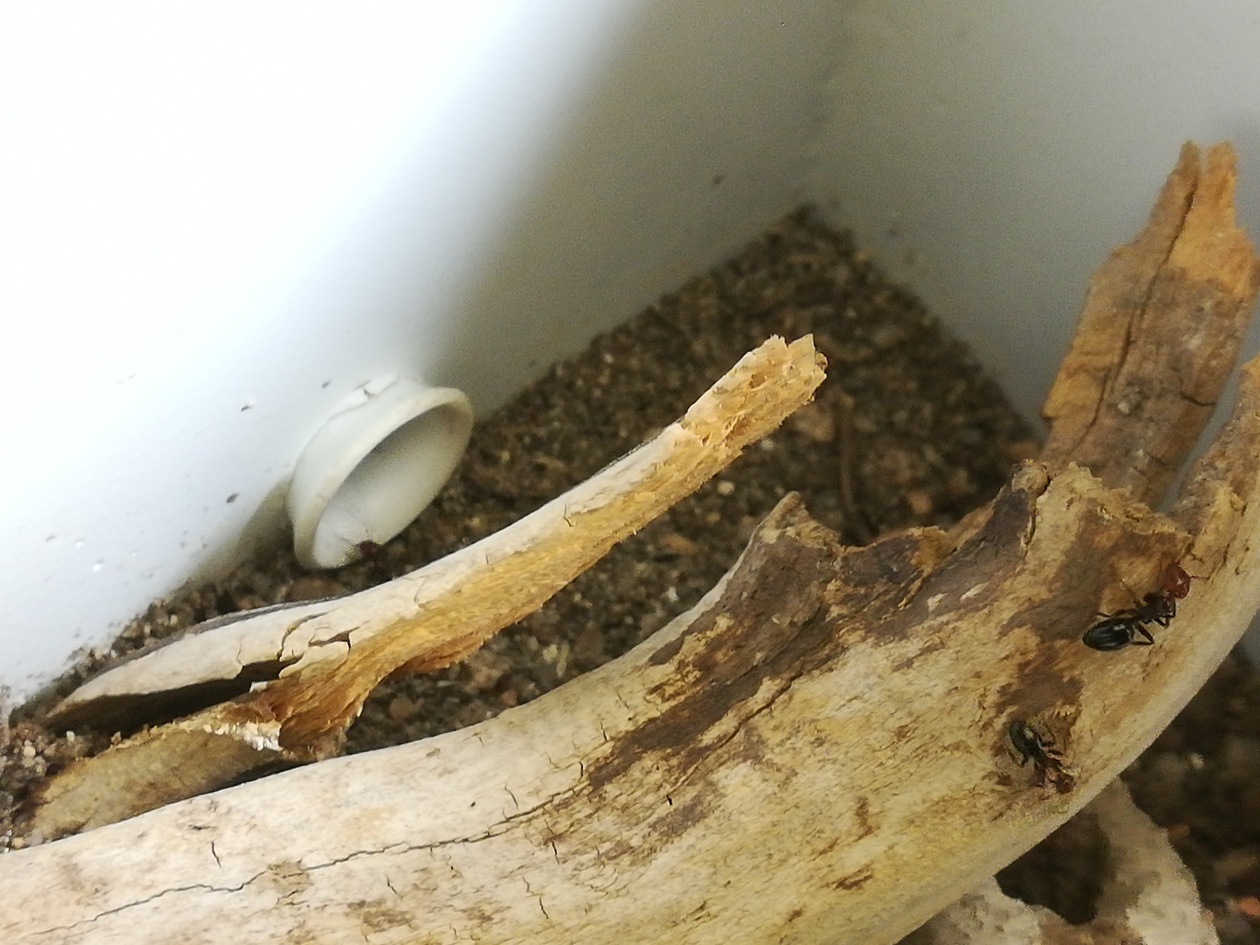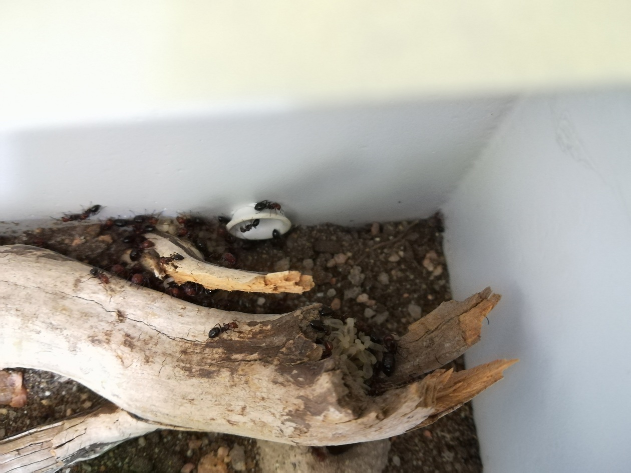 Con molta molta pazienza ho cercato di recuperarle tutte e le ho portate a casa provando a sistemarle nel formicaio che avevo realizzato tempo fa per i miei vecchi progetti. Si sono subito sistemate nel tubo che dal contenitore dove le ho trasportate porta al formicaio e li sono rimaste sistemandosi con uova, larve e pupe. Hanno anche cominciato a scavare una galleria nella poca terra che avevo messo nella parte alta del formicaio.