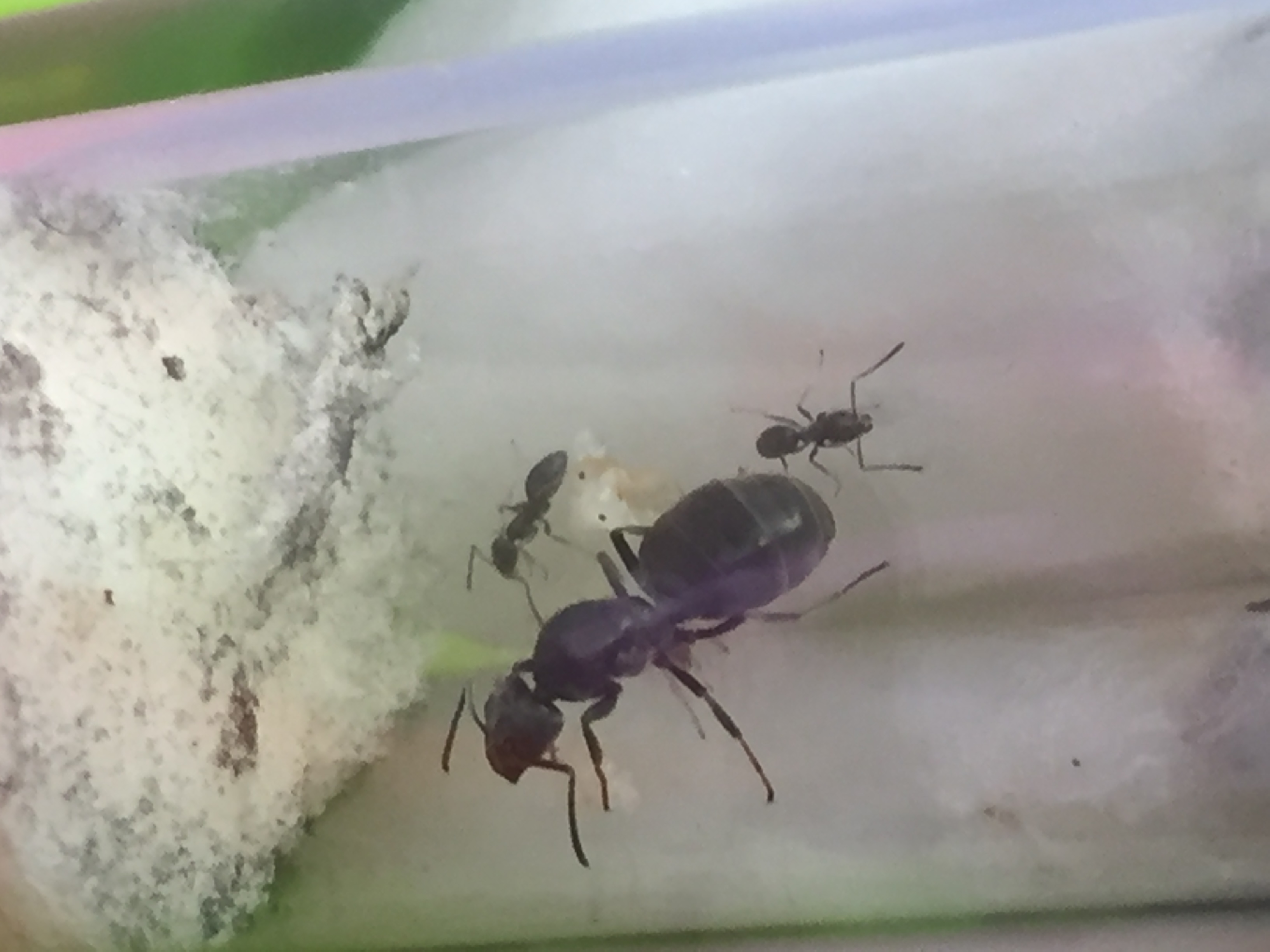 Buongiorno!! A Pasqua, a Reggio Calabria, in un giardino pieno di Pheidole e Camponotus micans ho trovato questa Regina, che ha deposto... oggi ho conntrollato e ha con sè delle minuscole operaie, 3, di cui una, non completamente pigmentata, non si vede nella foto... la regina è circa 1 cm... siccome aveva una piccola striatura sulla schiena, davo per scontato fosse un Camponotus micans... ora vedo le operaie poco slanciate, e ho qualche dubbio in proposito... sapete dirmi che formiche sono? E inoltre, tra quanto dovrei iniziare ad alimentarle io? L’anno scorso ho perso una colonietta simile perchè, alimentandole, si è formata muffa e mi sono morte tutte... scusate la mia inesperienza e la qualità delle foto, ma non voglio disturbarle troppo per fare foto stupende;-)