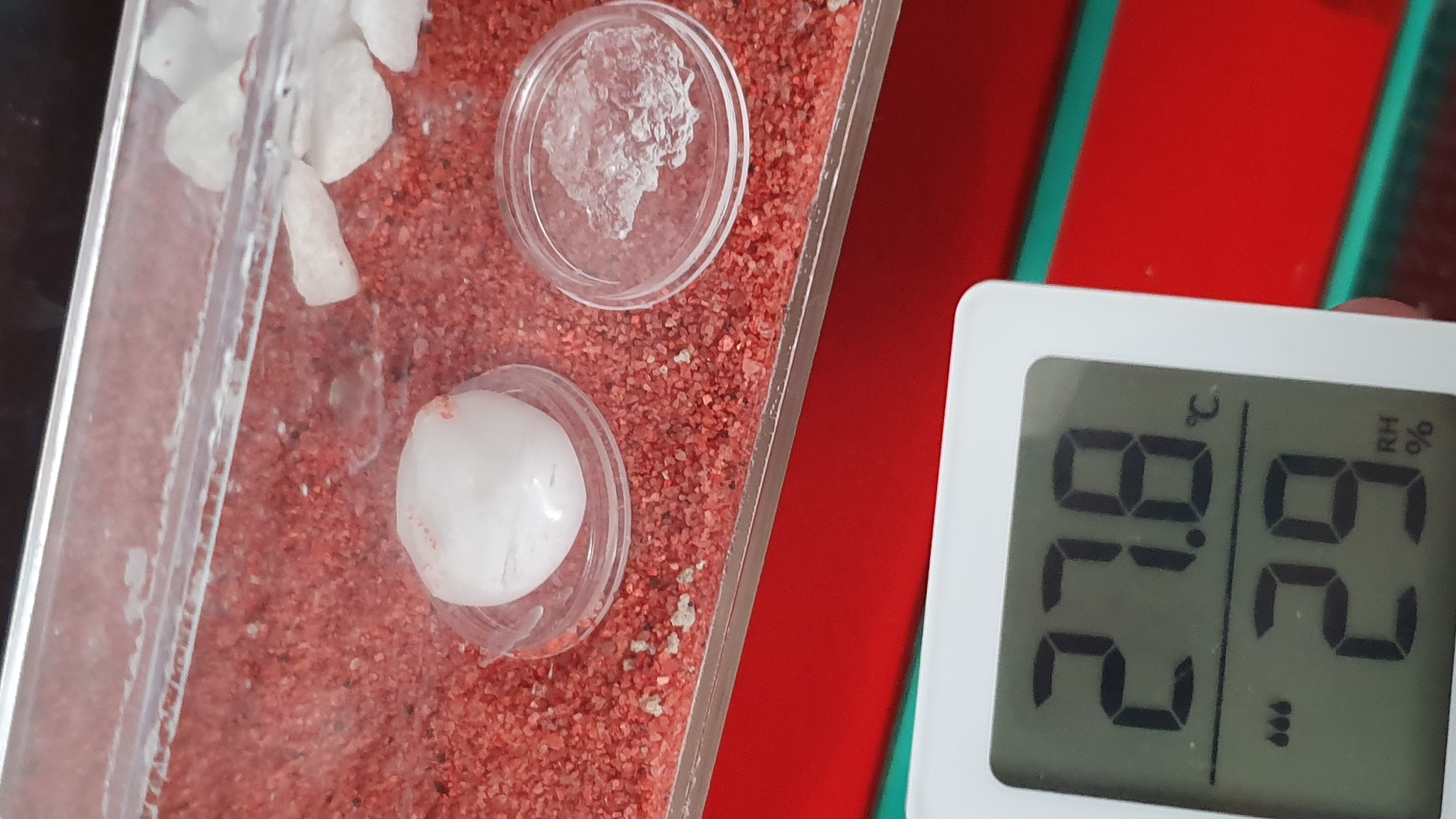 Il coperchio l'ho lasciato aperto siccome mi hanno detto che si può creare la muffa. Vi allego qualche foto con l'umidità e la temperatura. Devo chiudere la teca con il tappo oppure lo lascio aperto?