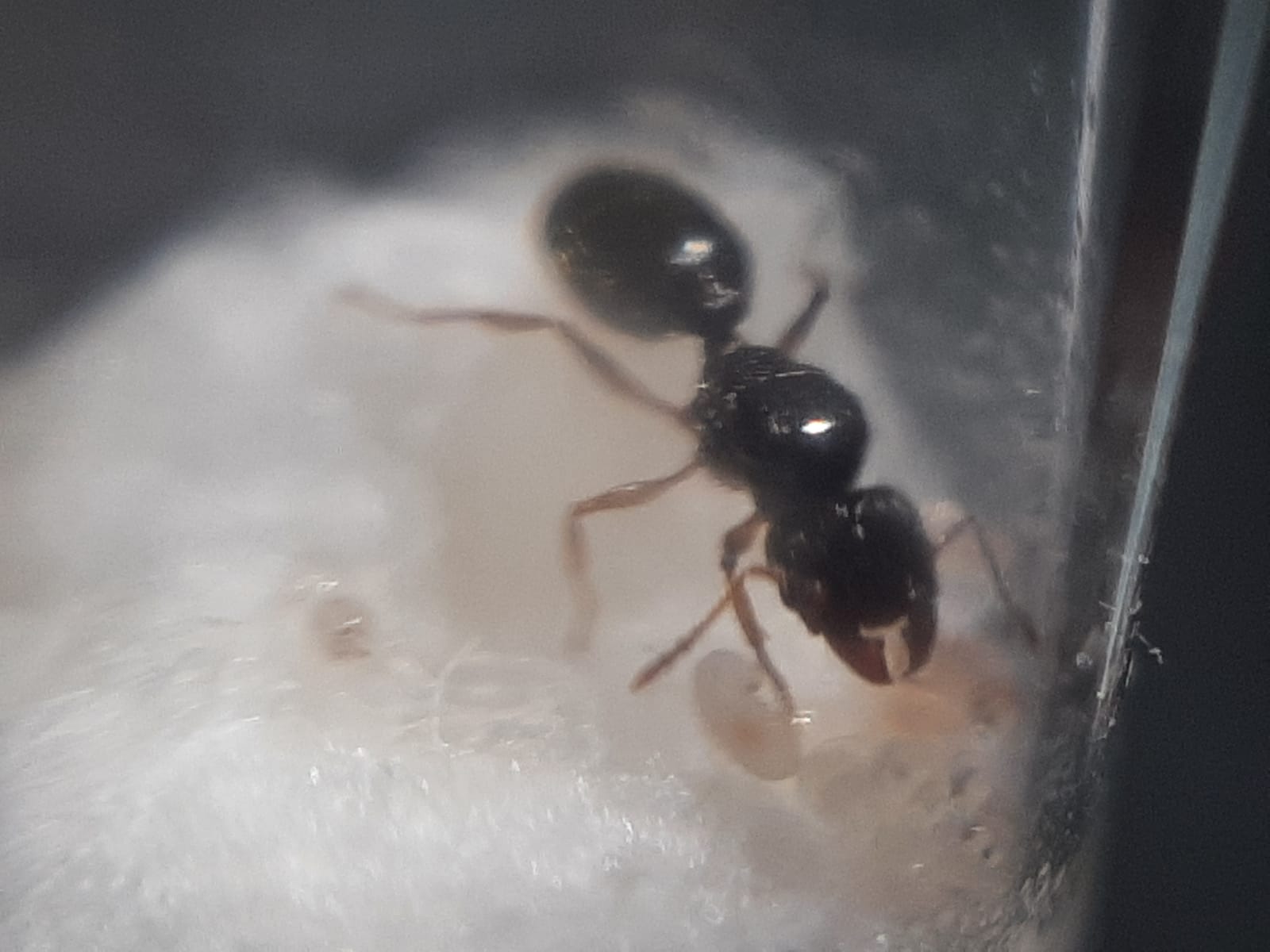 Un mio amico mi ha gentilmente spedito questa regina che aveva in piu' insieme a 3 regine in pleometrosi di Pheidole pallidula. Misura 8mm ed e' stata trovata a Roma ma non so dove. La regina ha gia' larve.