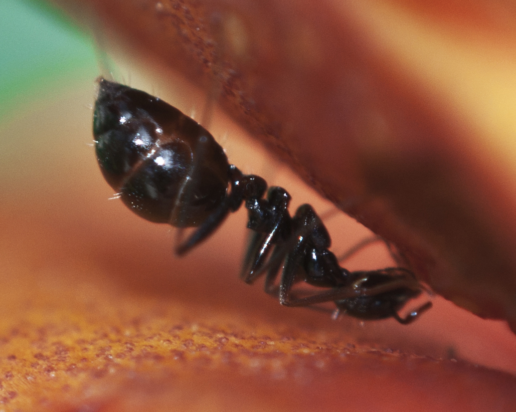 Stamattina con un amico uscendo per una caccia fotografica macro ci siamo imbattuti in queste formiche nere snelle e veloci su Campsis radicans. Questa suggeva dalla pianta e l`addome via via si gonfiava.