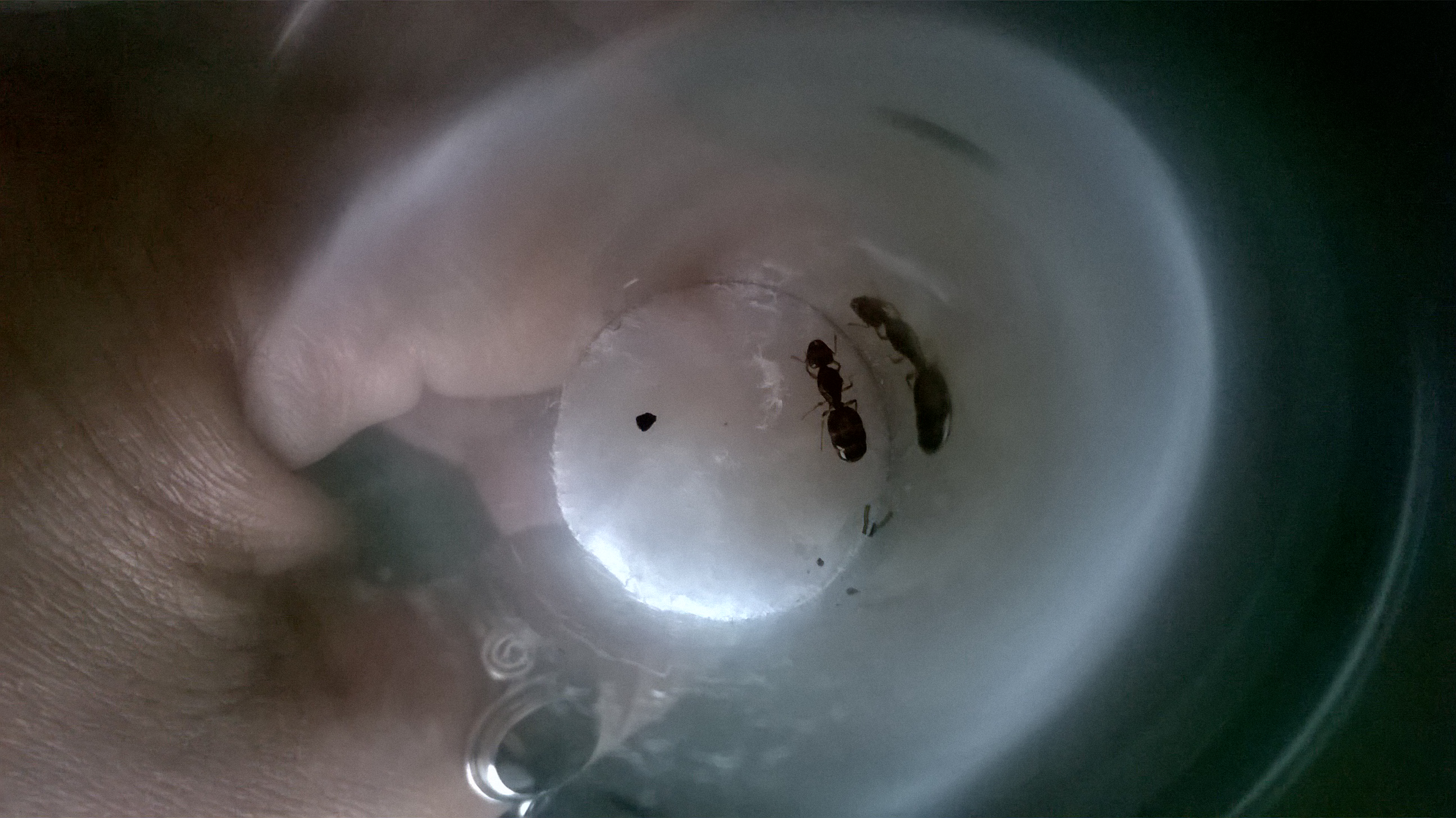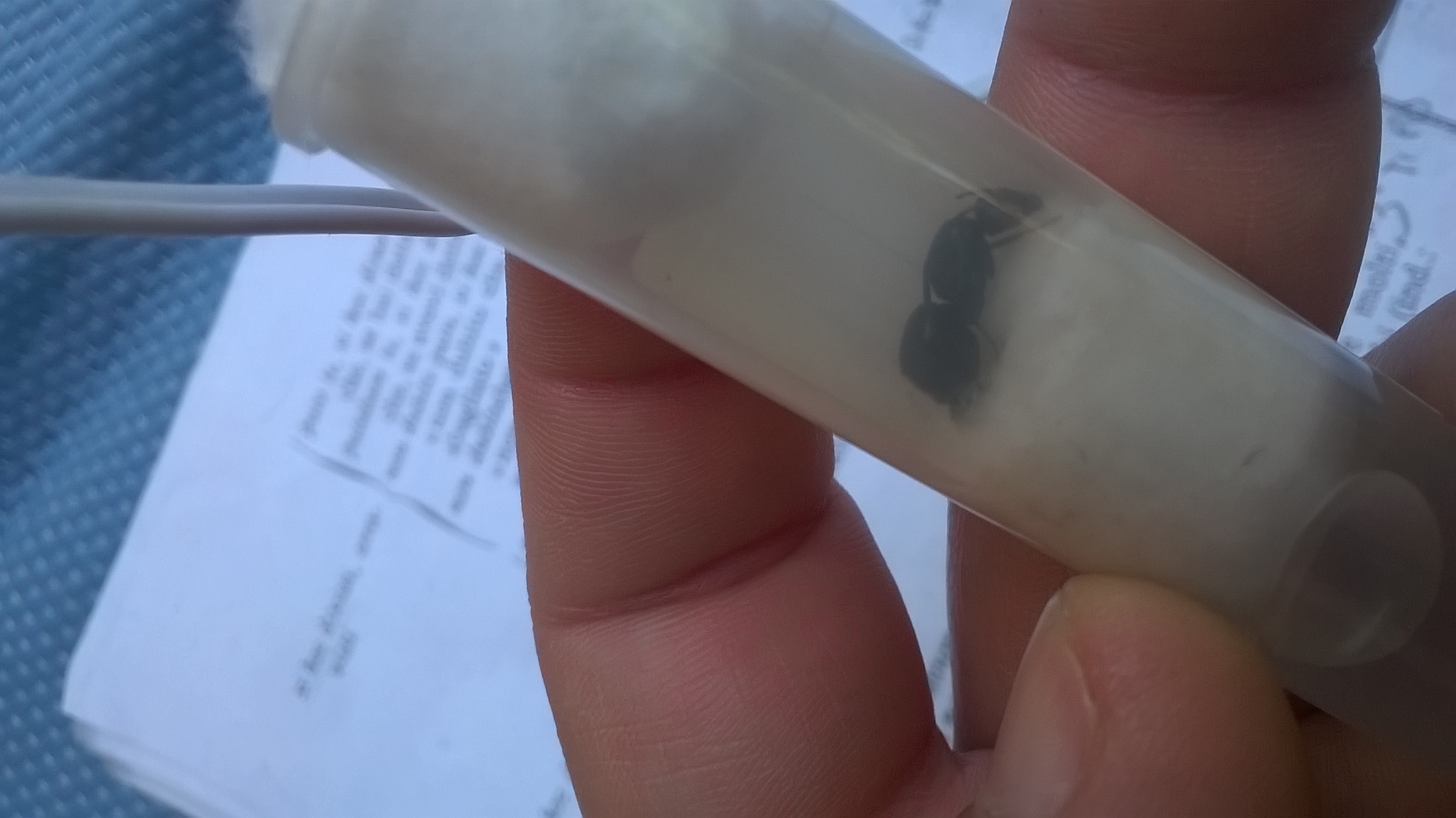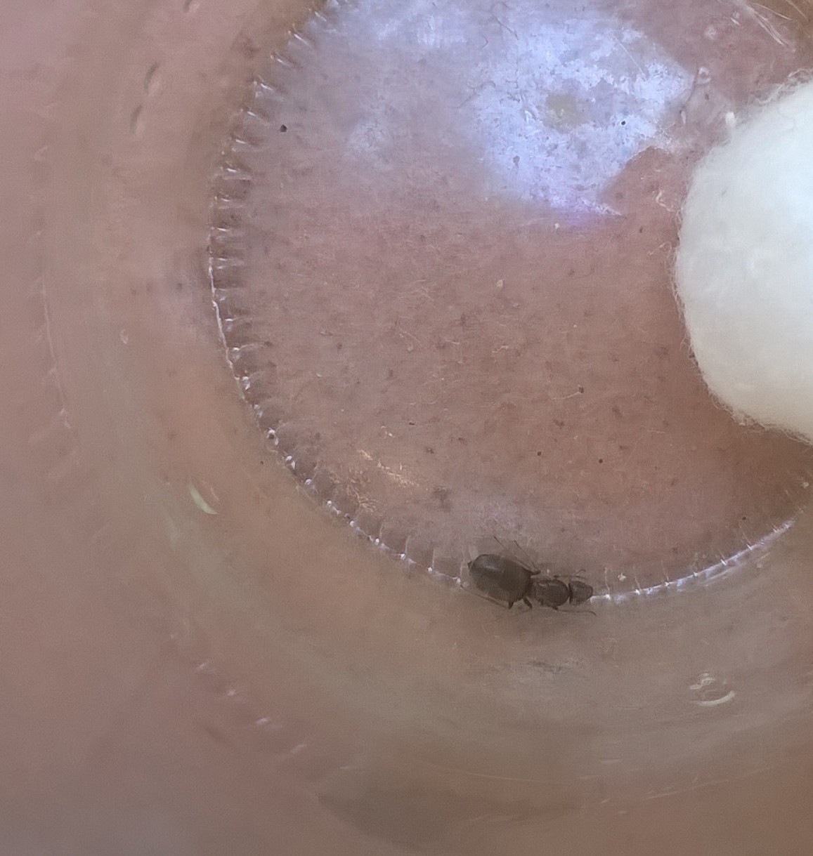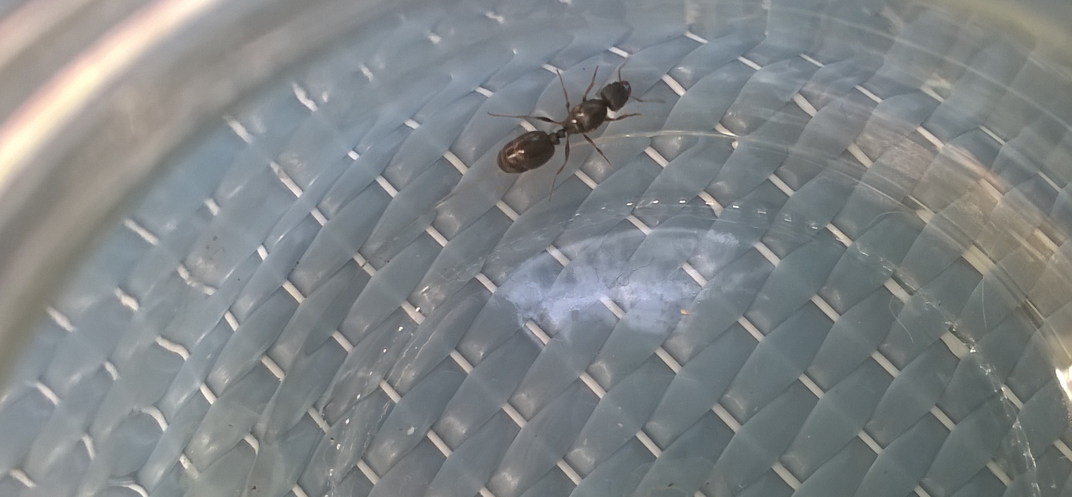 In questo periodo l'unione della buona vista e del mio notevole posteriore mi ha permesso di trovare una quantità di regine imbarazzante..prevalentemente sono Lasius sp che catturo e libero poco dopo, solo per poter familiarizzare con il loro aspetto..ieri il mio buon fidanzato mi ha procacciato questa..non è una formica minuscola, é il barattolo che è troppo grande..qualcuno che sappia dirmi che cos'è nonostante la pessima foto?