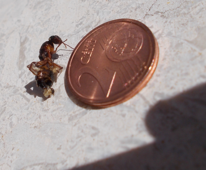 Ciao a tutti! La formica in questione è stata avvistata moribonda con l'addome schiacciato da un mio parente sotto una poltrona a sacco. So che non è utile nè congruo mostrare questo genere di foto, ma vista la dimensione insolita ho ritenuto opportuno farle e chiedere lumi a voi. Potreste dirmi di che specie si tratta? Grazie mille e spero che non sia il primo e ultimo post in questo meraviglioso forum