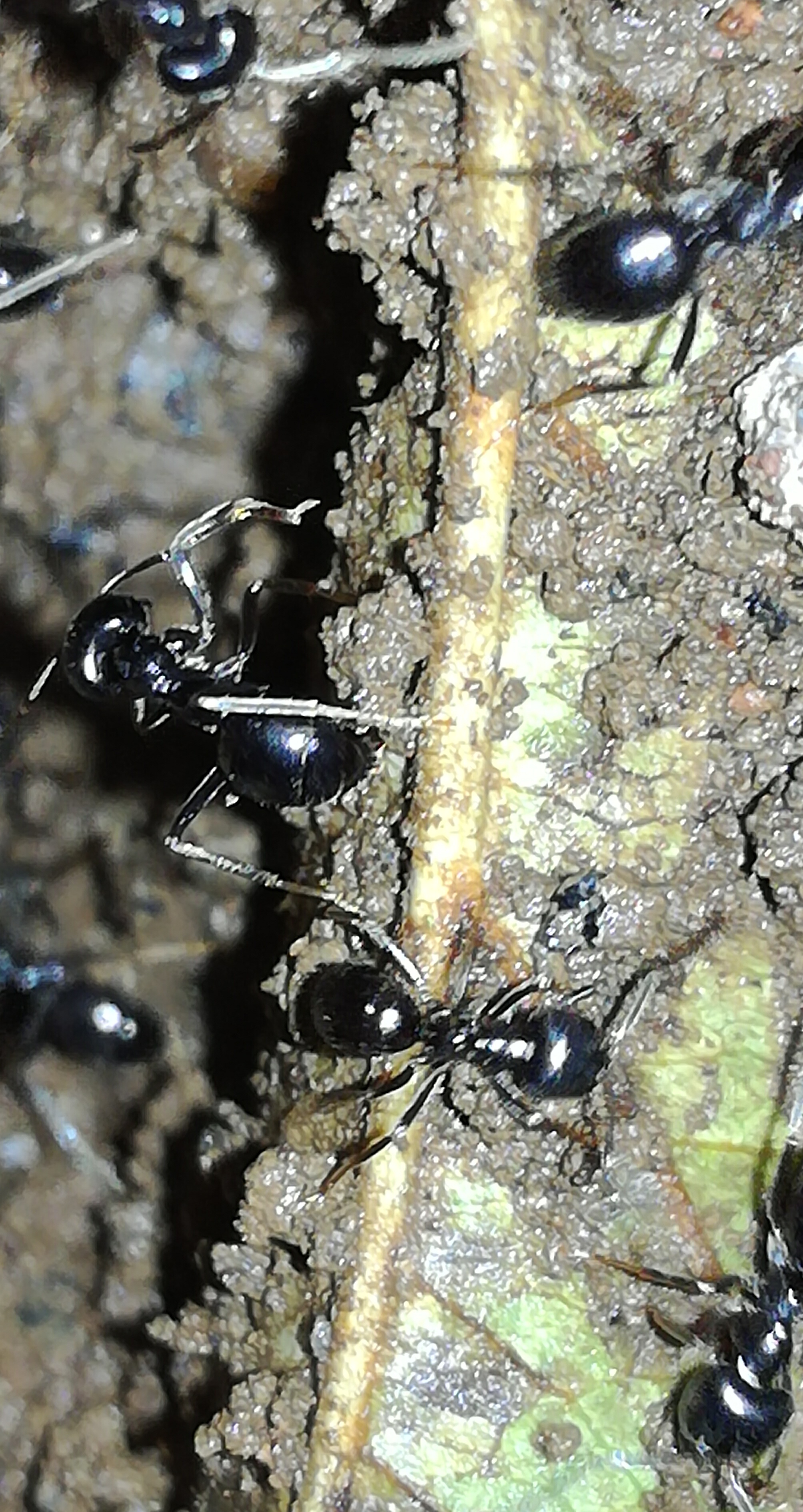 Le formiche "nere" per così dire, allevano afidi, hanno un nido enorme nel legno, con file che si estendono e si collegano ad un altro nido o deposito, non so come chiamarlo. Sono attualmente in semiletargo, si stanno riprendendo velocemente. Hanno una grande quantità di acido formico, non vengono predate neanche dai ragni, ho provato a metterle sulle ragnatele. Morso abbastanza doloroso, sono prive di pungiglione, non ho mai visto una formica del genere in giro, sarei contento se avessi una regina di questa specie.