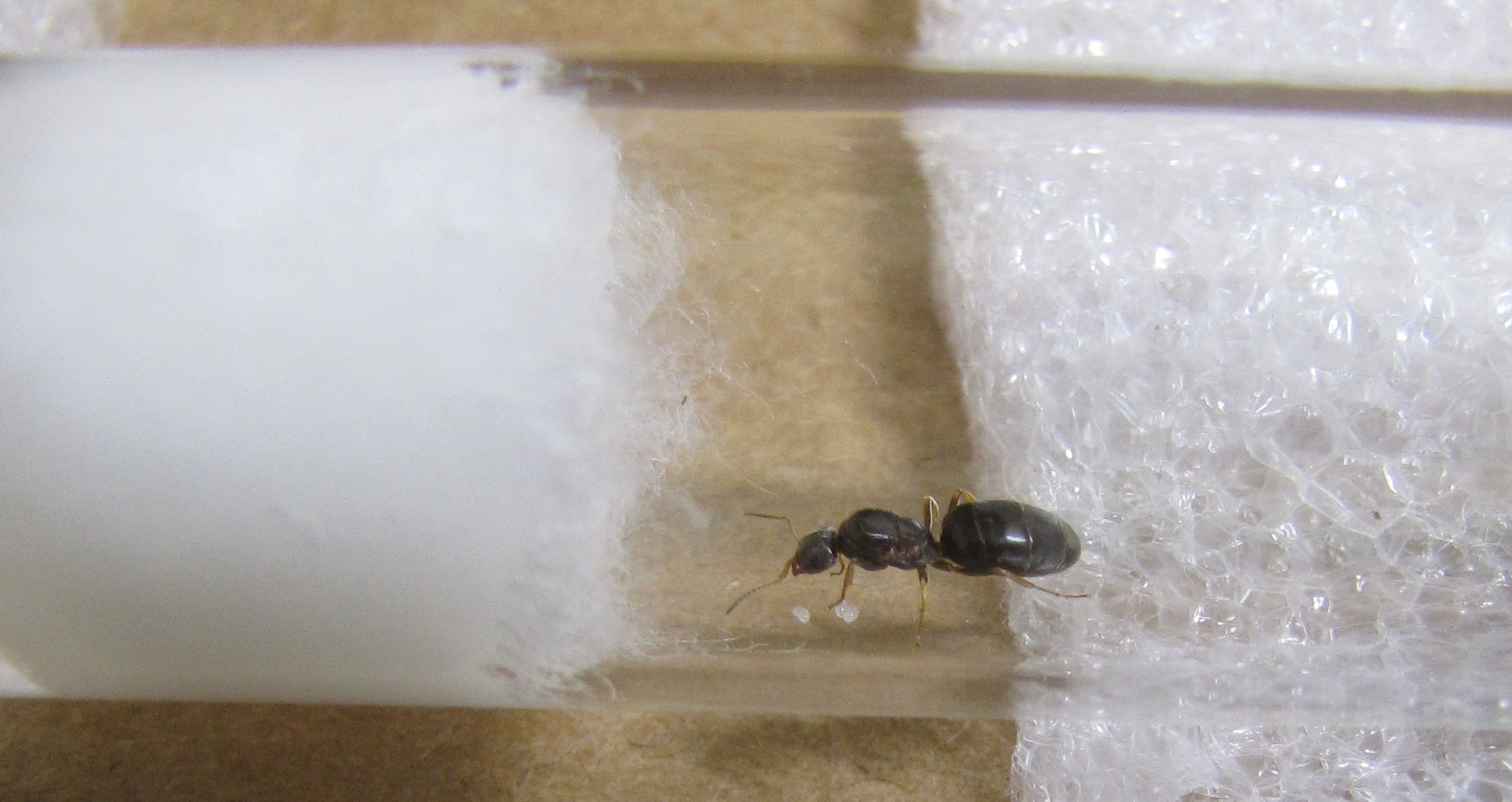 Dopo 24 ore la formica si è posizionata (ed ha portato le sue 6-7 uova) nella cannuccia di raccordo, in un punto stretto (si gira a fatica) e nascosto.