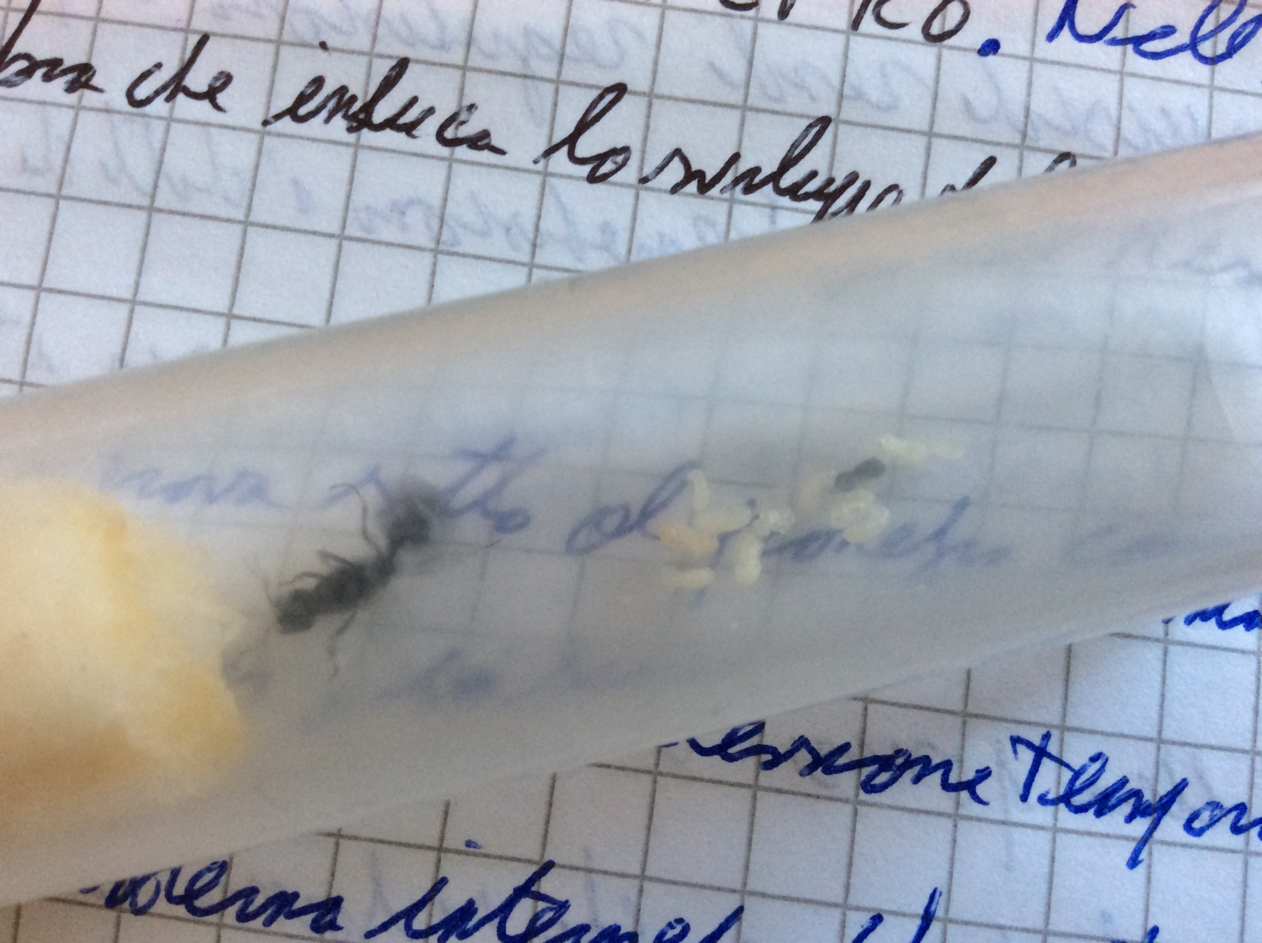 Aggiornamento: Capita spesso che le operaie vadano ad attaccare il cotone d'uscita, nonostante abbiano acqua e cibo all'interno della provetta. Qualcuno sa dirmi perché? il cibo che sto dando è miele diluito in acqua (assorbito da cotone idrofobo), lasciato per 1-2 giorni e successivamente tolto per evitare deterioramenti.