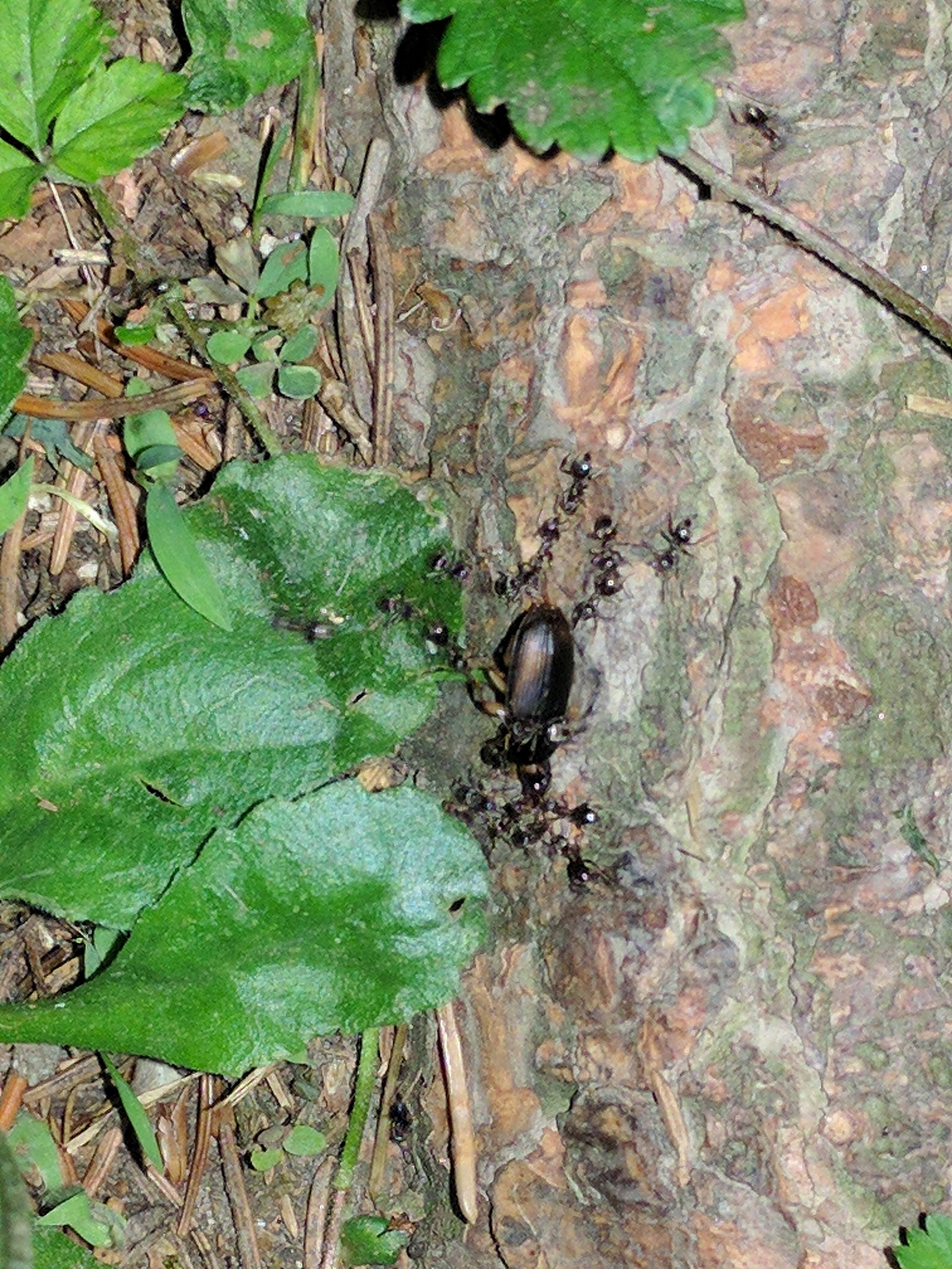 Invece nell'ultima foto, sapreste identificarmi che operaie sono ?(e magari anche cos'è la povera bestia che hanno attaccato) si trovano sotto ad un abete di 20 metri nel mio giardino, e hanno il formicaio nella terra ben protetto dagli aghi secchi.