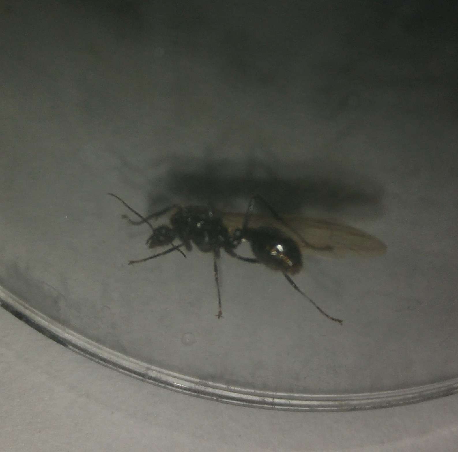 La presenza di molti maschi come questo trovati morti o morenti in zona mi ha spinto a scendere e cercare al buio tra le macchine. Alla fine, quasi quando stavo per demordere mi capita tra i piedi questa. Dovrebbe essere una regina della stessa specie, giusto?