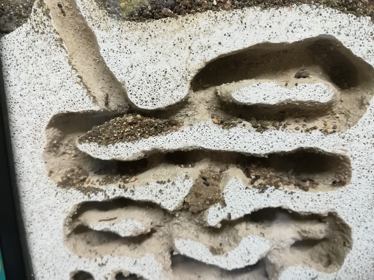 Comunque in questi giorni la colonia ha apportato dei cambiamenti spostando parte delle uova, pupe e larve all' ingresso dell arena. Hanno anche continuato a scavare nella terra ma hanno anche cominciato a modificare le gallerie del formicaio da me realizzato rimpicciolendo dei cunicolo con della terra. Vi invio delle foto.