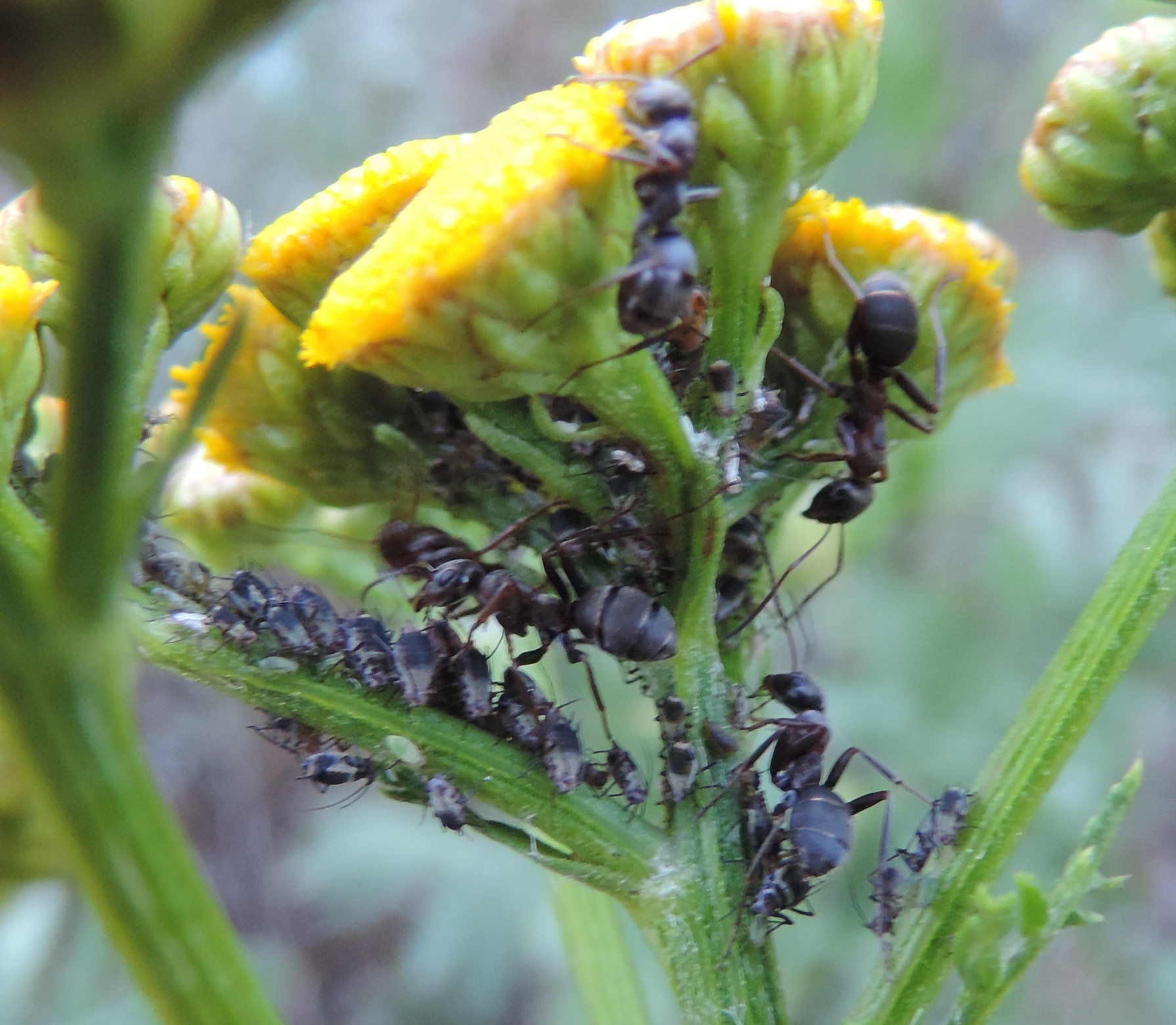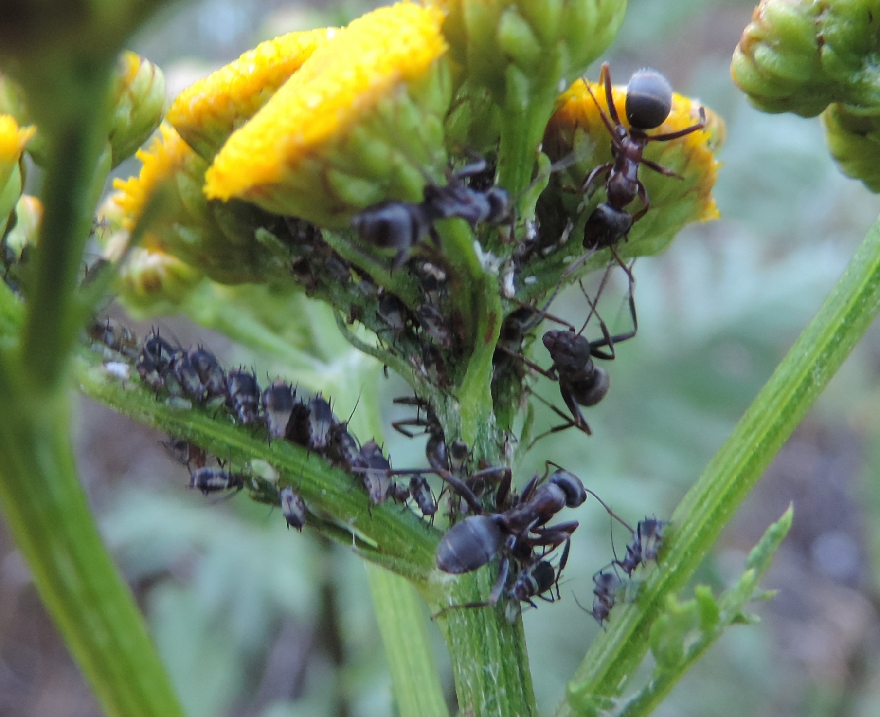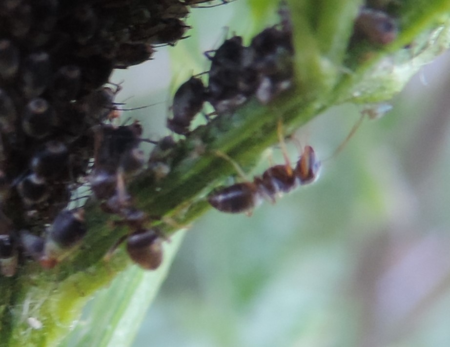 Fotografate in Val di Susa a Salbertrand (TO) il 21 agosto del 2016, a circa 1000 metri di quota, è possibile identificare queste formiche che si stavano occupando di una colonia di afidi? Gli afidi si trovavano su un Tanaceto e appartengono alla specie Metopeurum fuscoviride, che mi dicono dovrebbe essere regolarmente allevata da Lasius niger. Tra l’altro ho l’impressione che ci fossero due specie diverse, perché gli esemplari delle prime due foto sono molto più grossi degli afidi e mi sembrano delle Serviformica mentre quelle delle ultime (purtroppo sfocate) sono decisamente più piccole e potrebbero essere effettivamente delle Lasius…