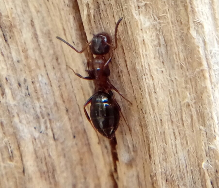 Mi trovavo in provincia di Latina, sui 500m, osservavo un nido scavato in ramo secco di un mandarino, delle formiche sui 7-8mm forse 9, che ritengo siano Camponotus sp., queste stavano spesso immobili lungo il tronco e negli incavi nei pressi del foro; tra di loro si aggiravano altre molto più piccole 2-4mm che sono riuscito ad osservare attentamente, forse erano conspecifiche, sorelle.