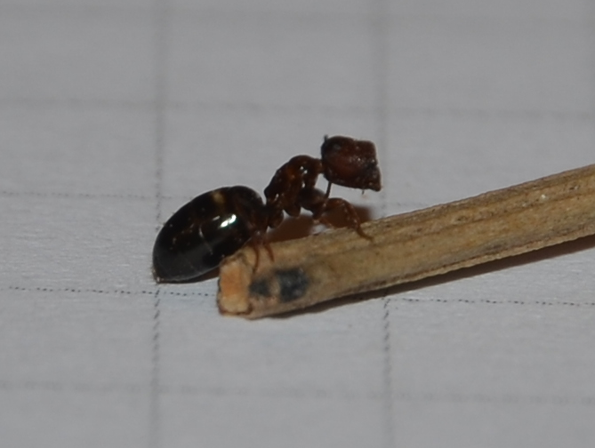 Salve a tutti, vorrei chiedervi una mano ad identificare la formica che vedete nelle foto allegate. Abitava in un ramo secco di un pruno nelle Marche (tra la provincia di Fermo e quella di Ascoli) a circa 300 metri di quota. Le foto dovrebbero essere di un'operaia ma correggetemi se sbaglio. L'indole mi sembra abbastanza tranquilla. I quadretti del foglio su cui si trova sono da 5 mm, quindi lei dovrebbe essere tra i 6 e gli 8 mm. Chi più chi meno hanno tutte l'addome abbastanza allungato. Credo di aver visto anche delle major.
