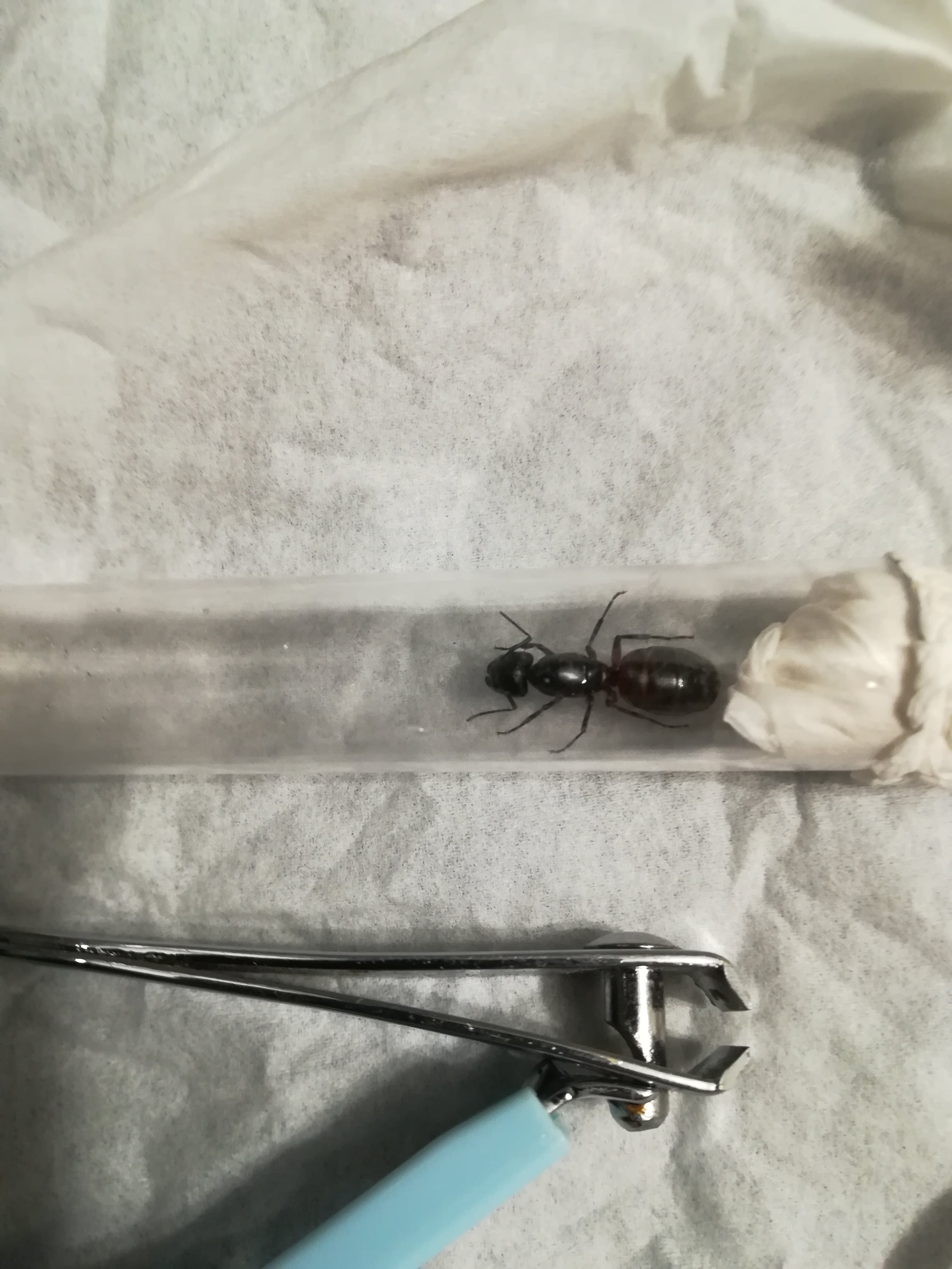 credo che sia sciamata ora..ne ho viste numerose con le ali a terra.ha mandibole enormi e scava il cotone della provetta per cercare di uscire