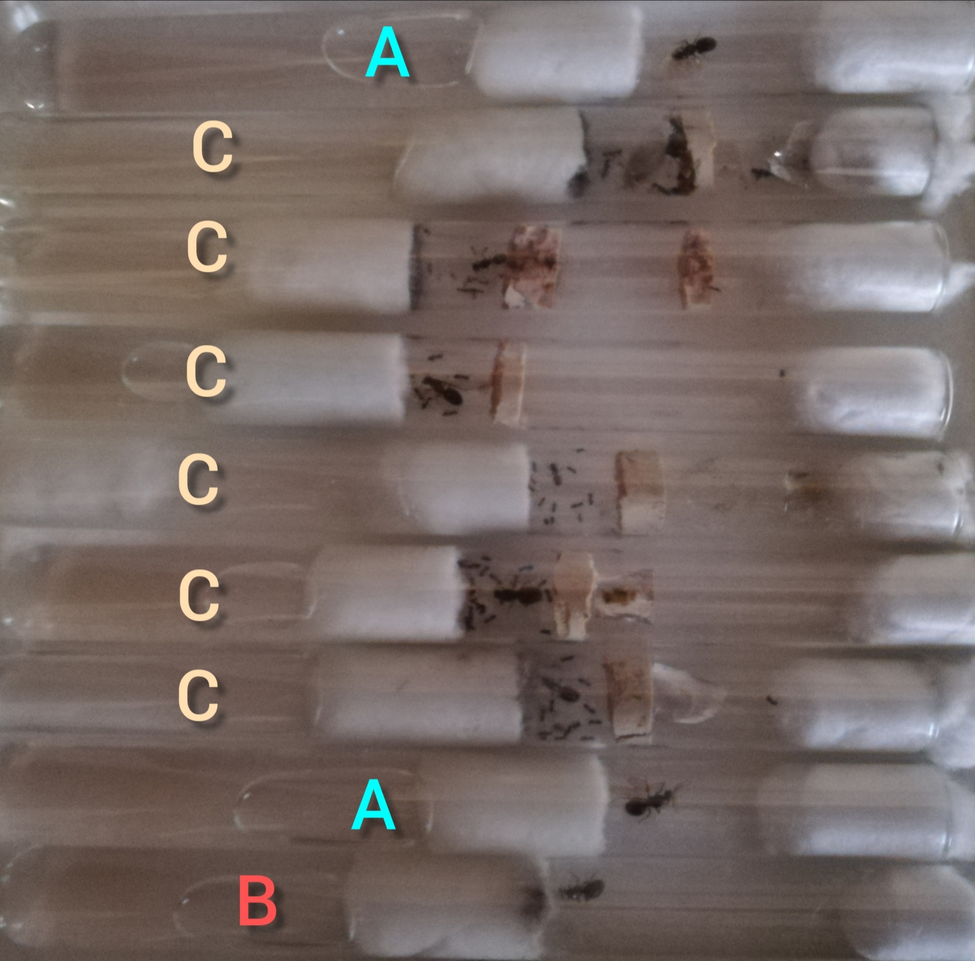 -C: Variante che uso io: lascio il serbatoio al massimo a 1/3 di provetta e divido in due lo spazio abitabile posizionando un sughero o un polistirolo (del diametro della provetta) a 1-1,5 cm circa dal cotone bagnato (il pezzo sarà forato o rotto in modo da creare un piccolo spiraglio per le formiche). Così facendo la regina non rinuncerà ad uno spazio stretto e accogliente (Zona Umida) e non avremo problemi con la somministrazione del cibo o fughe (ampia Zona Secca). Ecco delle foto, spero di essere stato chiaro.