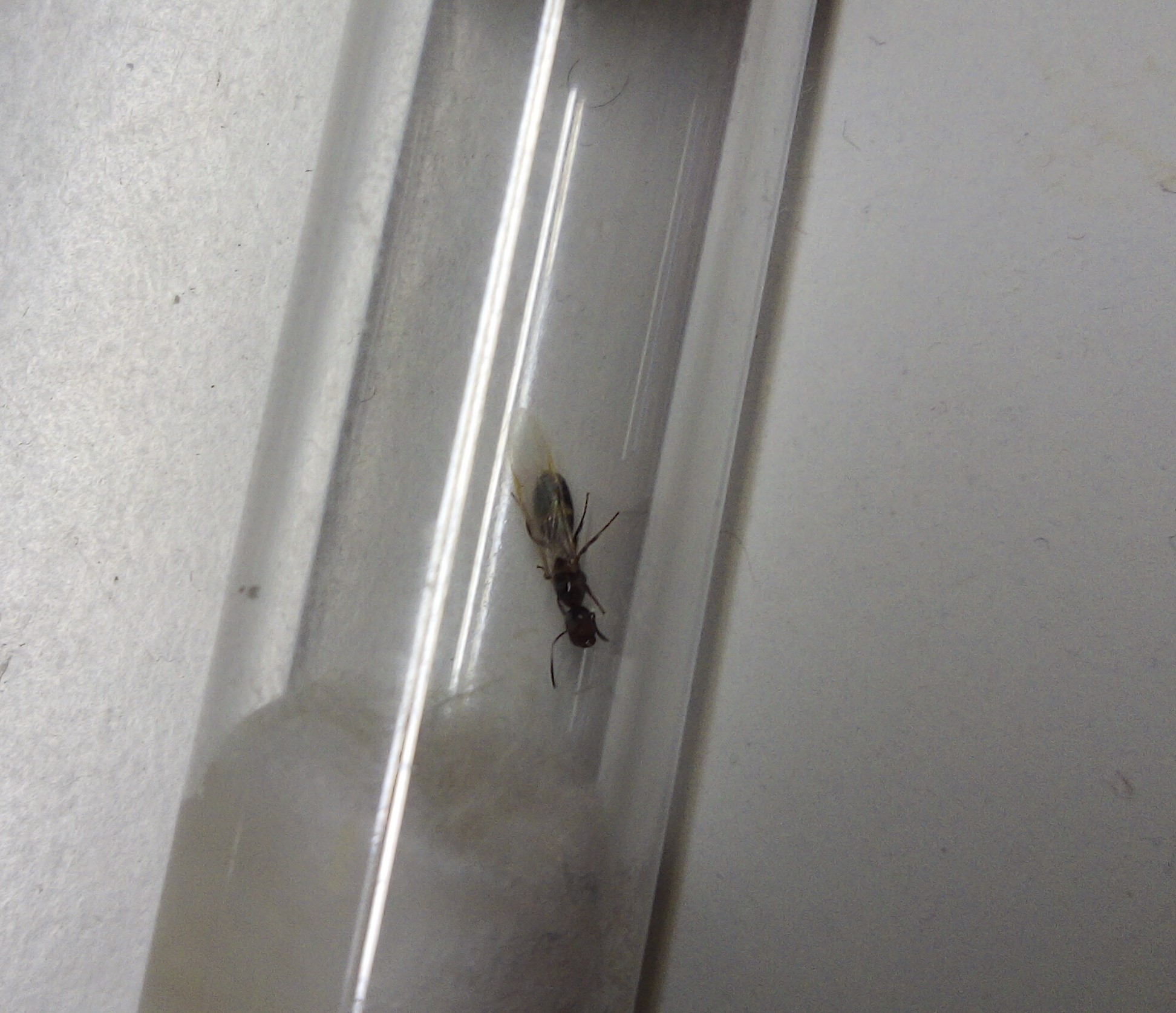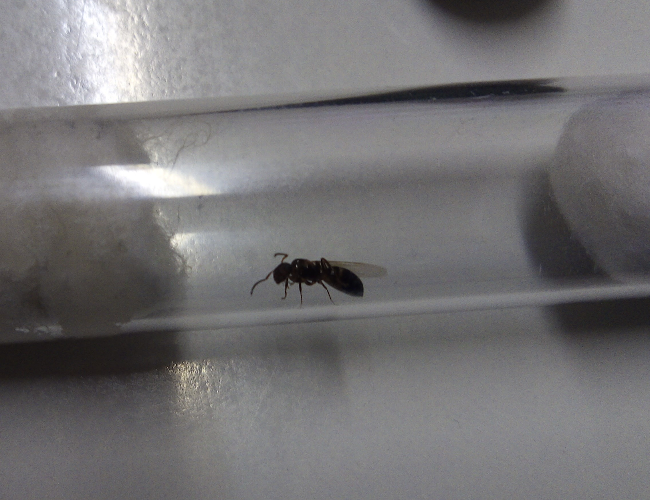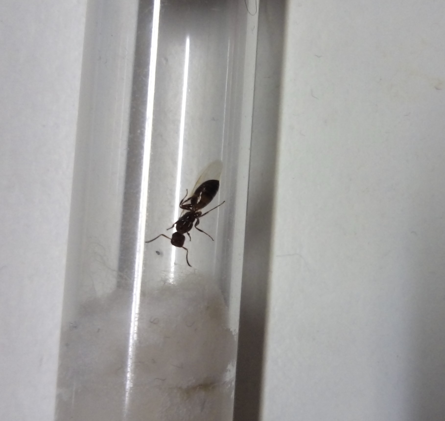 Ciao, non ho esperienza con questa specie, ma con colonie che fondano nel legno e semi claustrali. Il setup sembra buono. Io avrei messo per comodita' mooolto meno sughero, solo una piccola striscia con un buco al centro cosi' riuscirai a nutrirla meglio. Prova a fornirle un moscerino e una goccia di miele e vedi come si comporta. La mia Tetramorium caespitum ha ancora meta' ali e ha una valanga di larve. Buon allevamento!